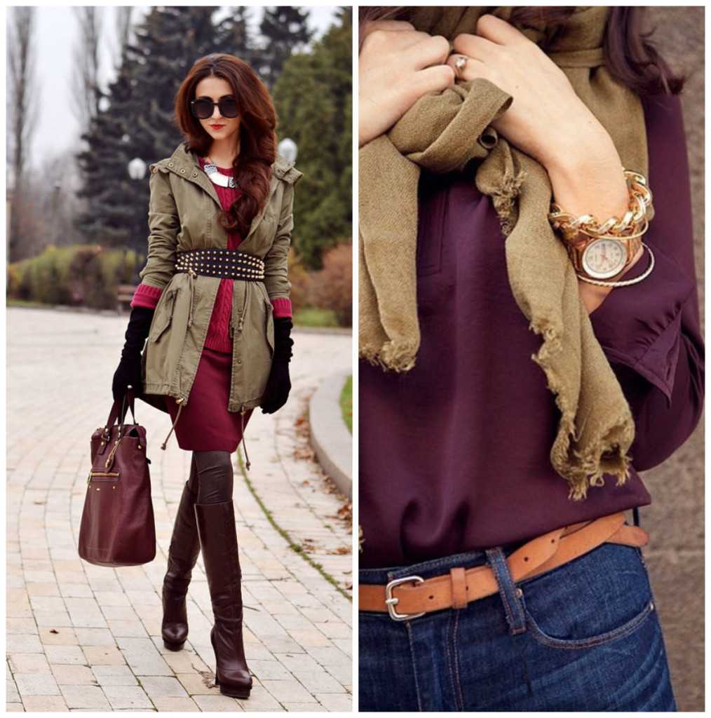 Комбинирование вещей оттенков хаки и бордо используется при воплощении образов в стиле милитари. Дополнят ансамбль ботинки на грубой подошве.