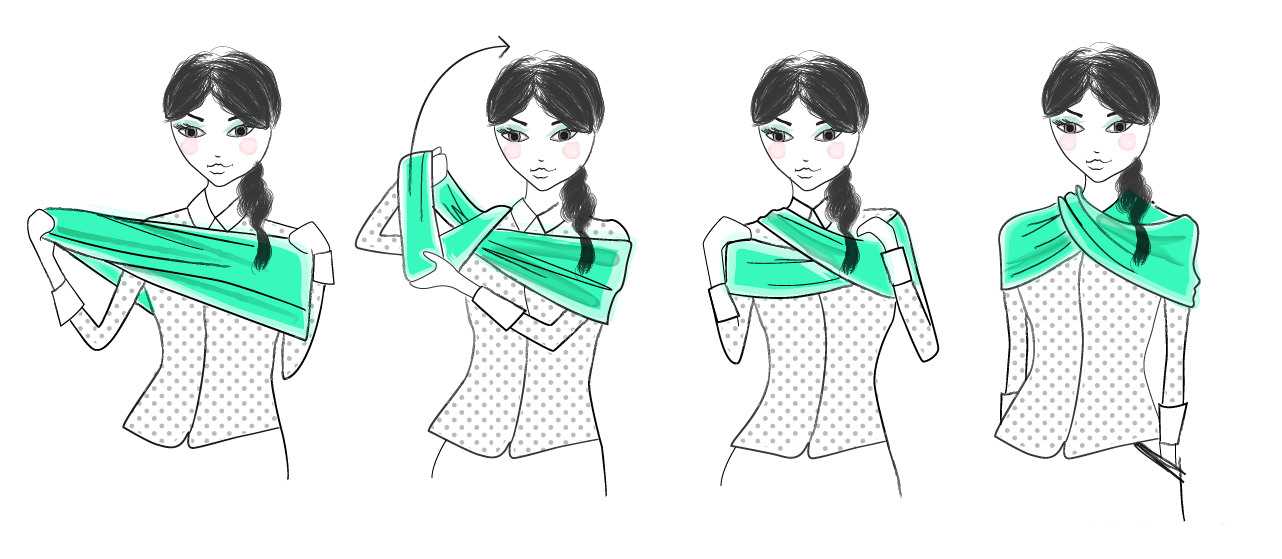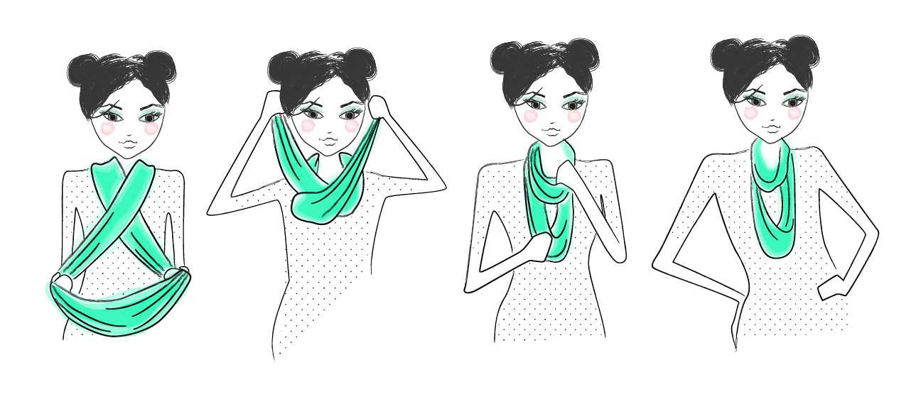 Нужно только набросить его на плечи, а снизу завязать в узелок. После, его следует перекрутить так, чтобы образовался знак бесконечности и получившуюся петлю еще раз набросить на себя.