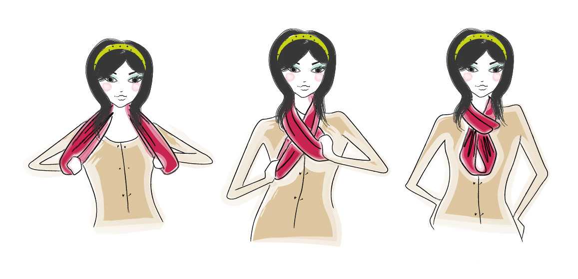 Что касается техник, ниже мы привели универсальные способы с фото-примерами, с помощью которых вы без особых усилий сможете дополнить свой аутфит броским аксессуаром в виде красиво завязанного шарфа.