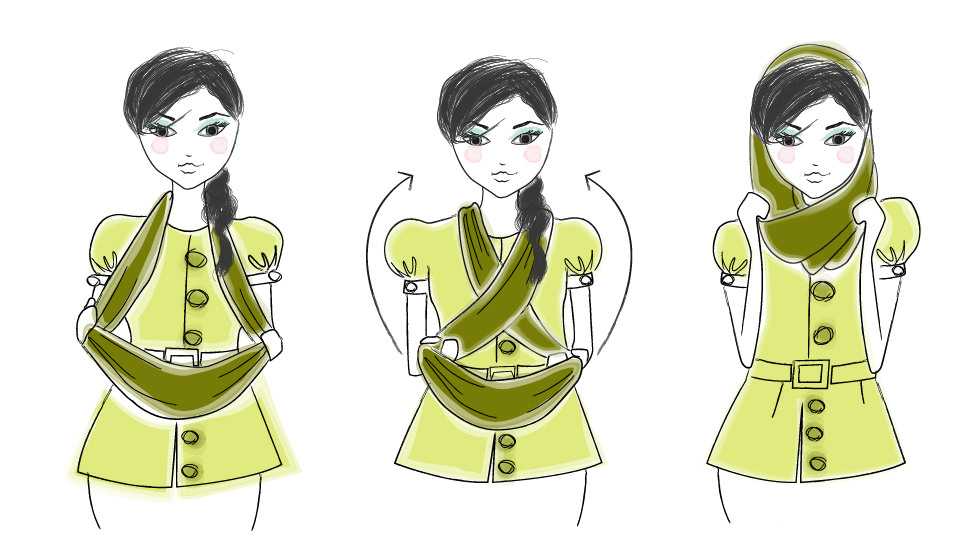 Еще один легкий способ, суть которого состоит в том, что шарф или платок надевается так, чтобы концы свисали сзади. Далее, их следует перекрутить, вывести наперед и завязать в объемный бант.