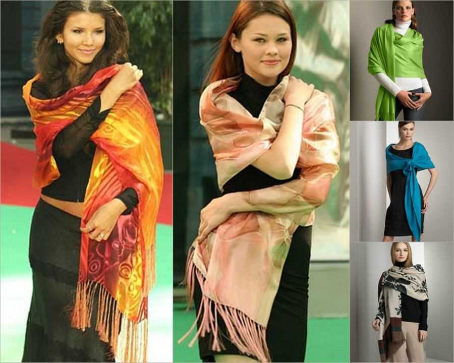 Как завязывать женский шарфик понятно. Но, на этом разнообразие шарфов не закончилось, ведь есть еще удивительный вариант – палантин. Большой шарф может быть: из шелкового или плотного трикотажного материала; связанный из тончайшего козьего пуха или из натурального меха. Предлагаем несколько способов, как использовать большой шарф: