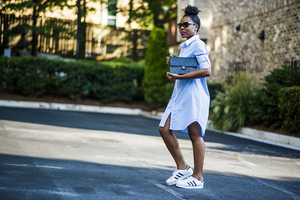 Платье-рубашка и кроссовки – еще один пример классического сочетания, который отлично подходит для лета. Интересно, что этот образ одинаково хорош и для молодых девушек, и для женщин старше 40 лет. Конечно, многое зависит от выбранного фасона, его цветовой гаммы, дополнительных деталей. Простые правила при подборе наряда: