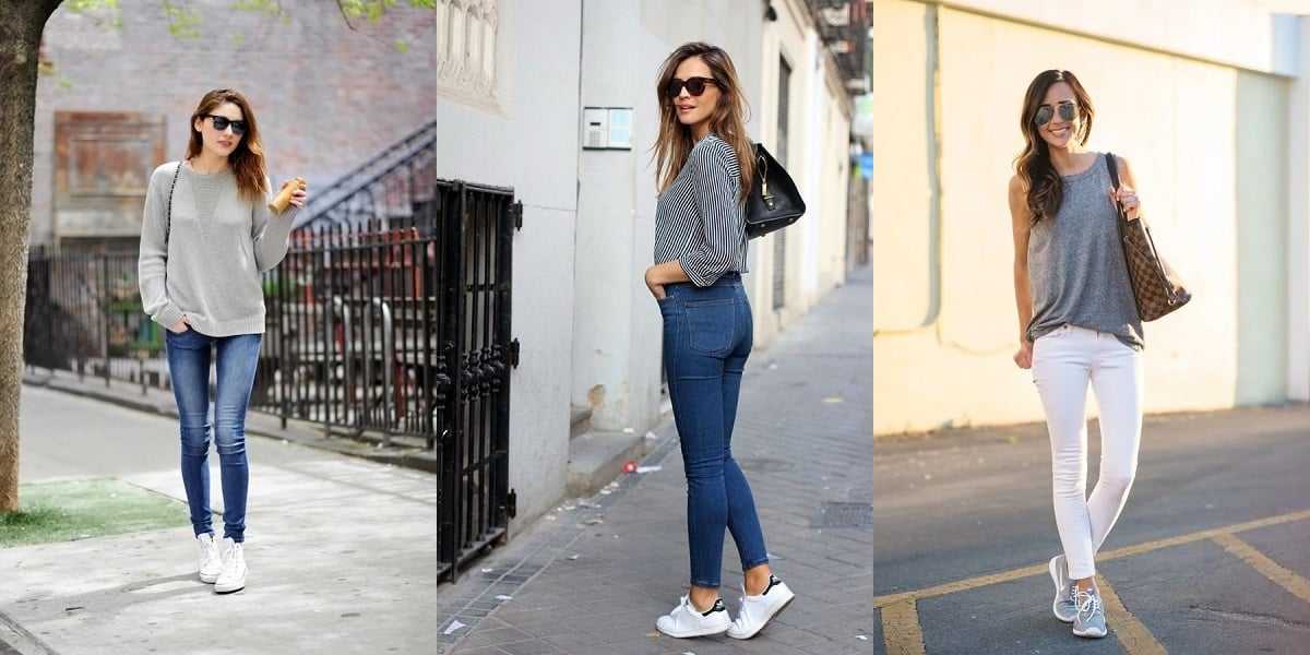 Обувь под джинсы скинни подобрать не так уж и сложно. Для повседневного образа подойдут кроссовки, кеды, слипоны. Можно выбрать ботинки — челси, оксфорды сделают лук моднее. Если же хотите быть более женственной, стоит выбирать туфли или босоножки на каблуке. Нужно помнить, что джинсы скинни тогда не подворачиваются.