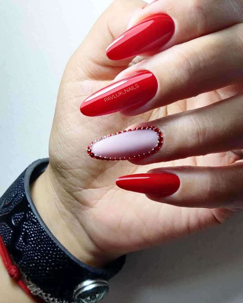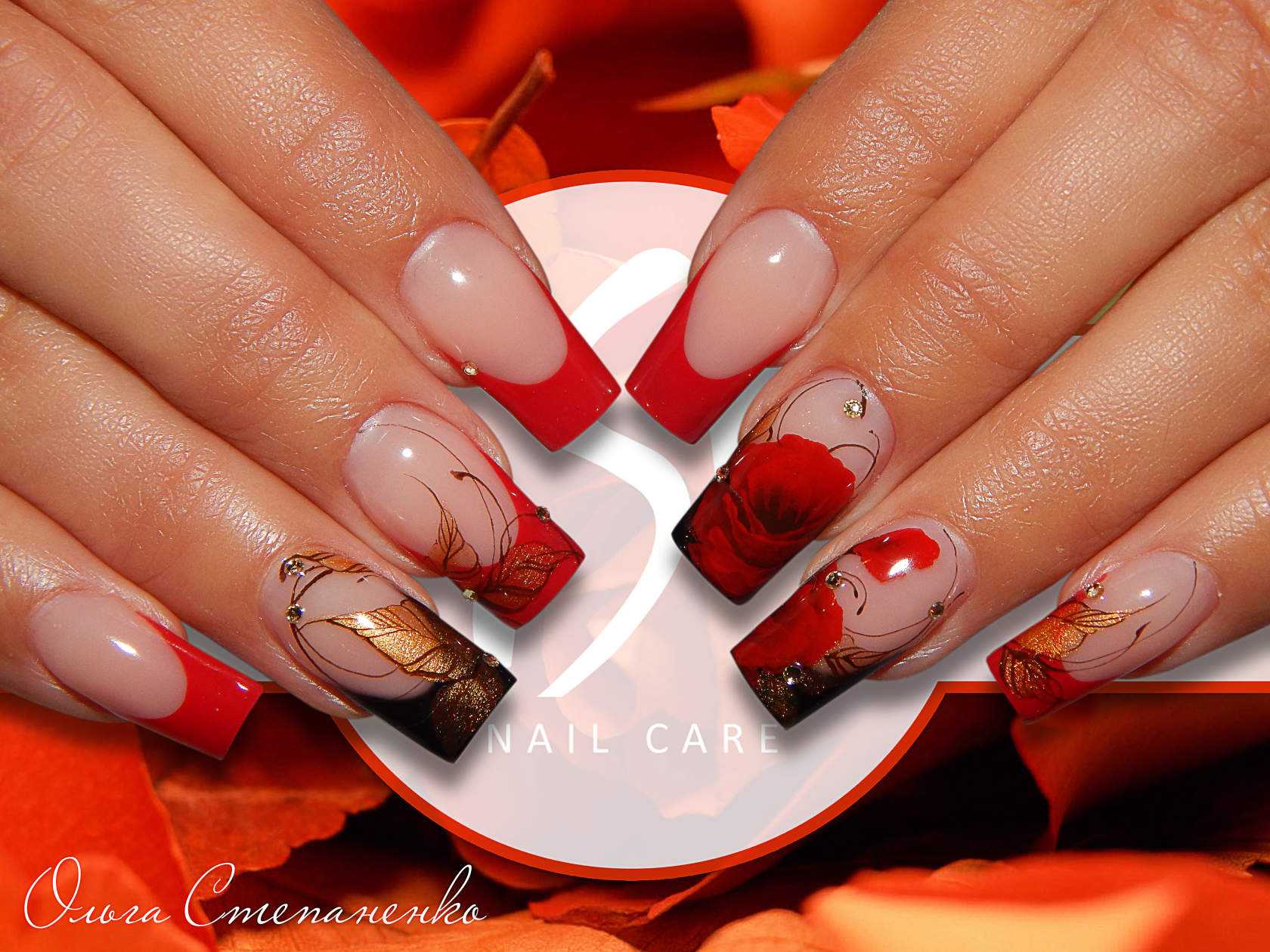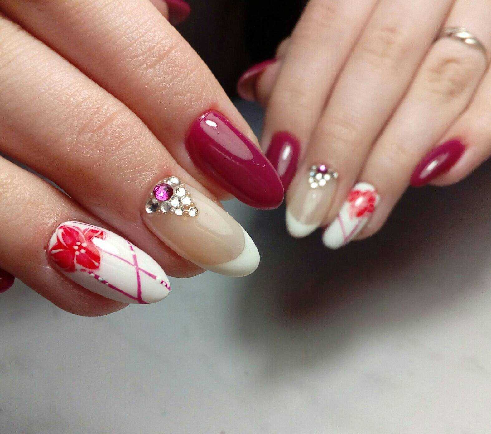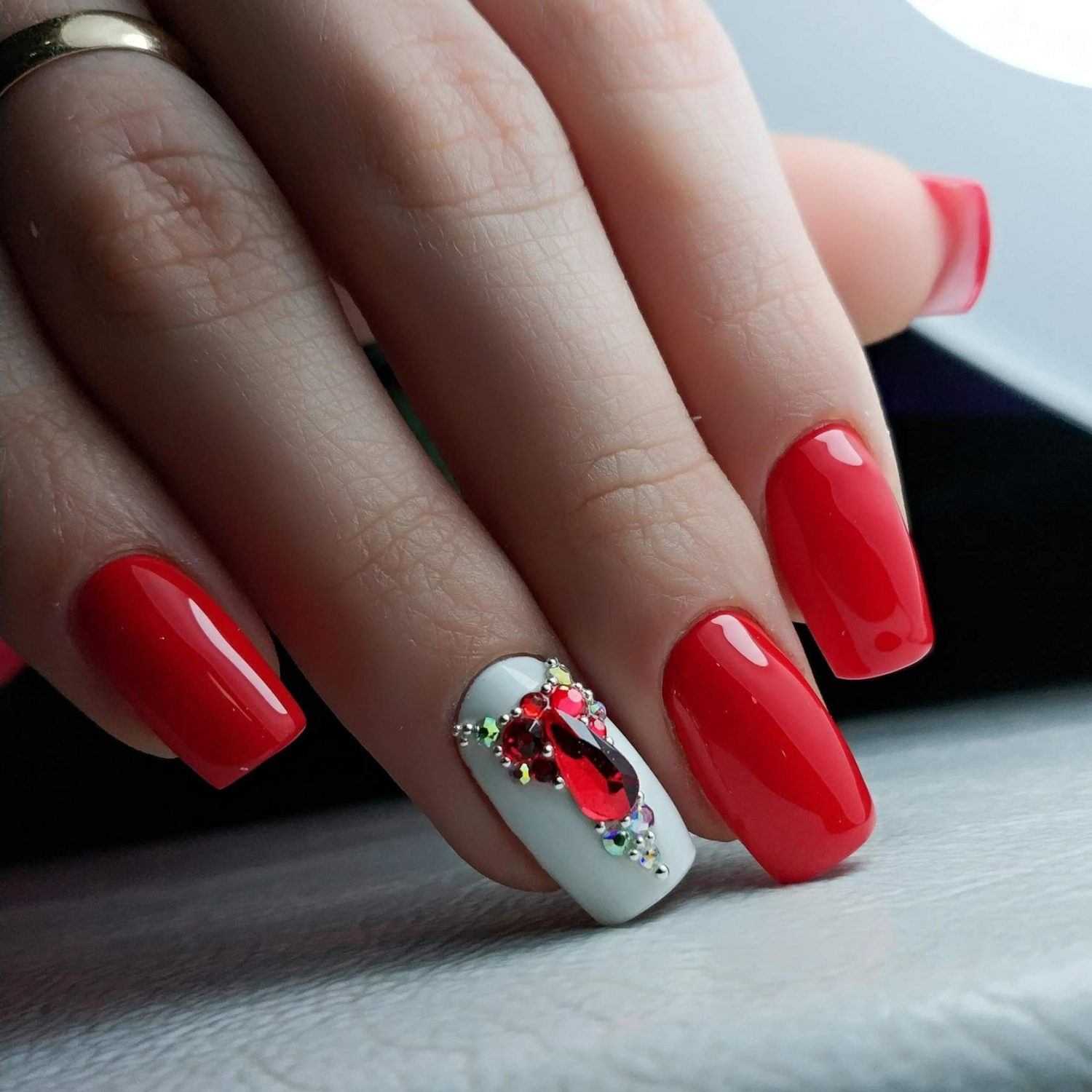 Чтобы маникюр выглядел стильно и изысканно, рекомендуется дополнительно разбавить красный цвет дополнительными оттенками.