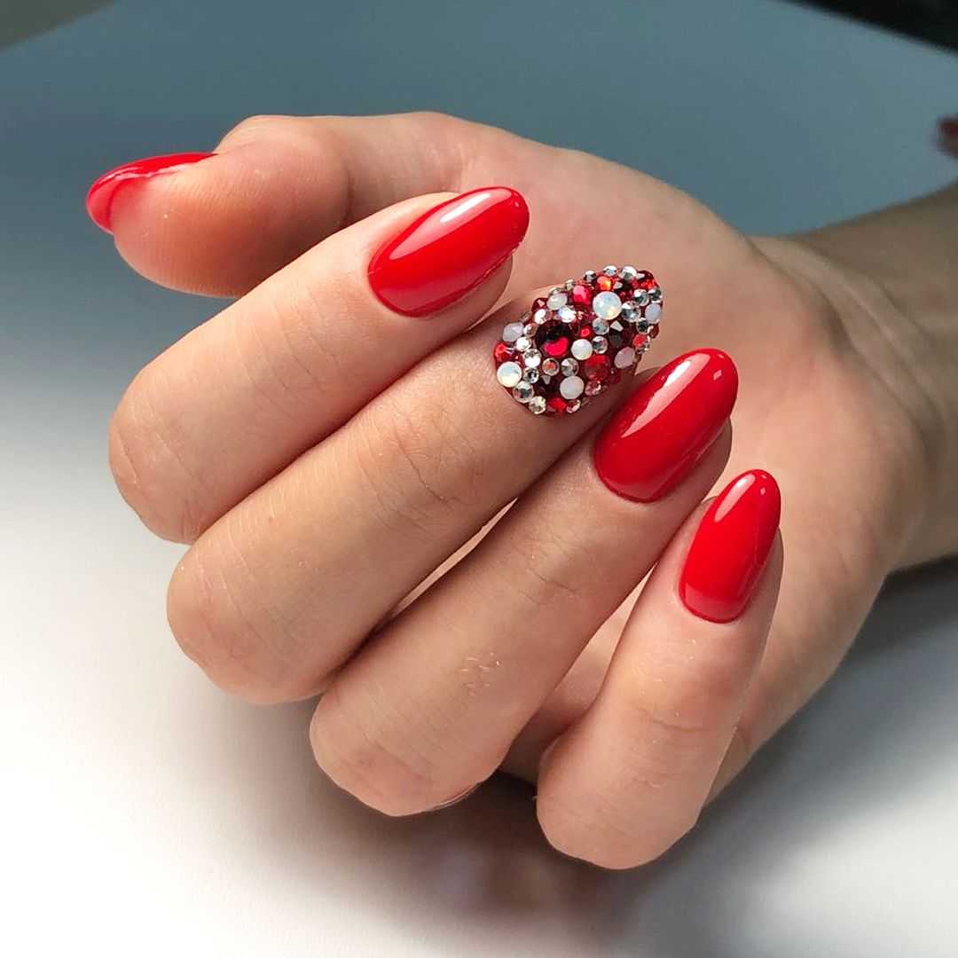 Красный блестящий маникюр со стразами на коротких ногтях.