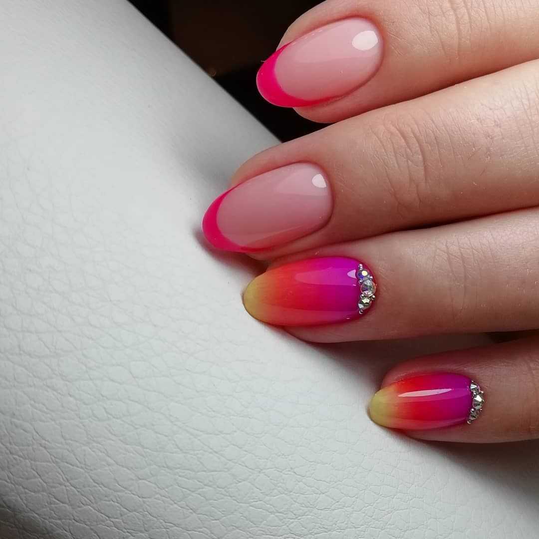 Модные тенденции маникюра френч — разноцветные кончики на ногтях вкупе с хрустальной крошкой.