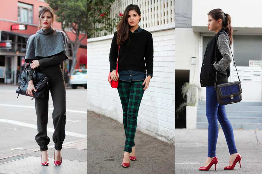 Для тех, кто выбирает, прежде всего, комфорт, также есть варианты выглядеть ярко и привлекательно. Классические брюки со стрелкой, брюки – палаццо топы постельных тонов, надетые под пиджак, также считаются одним из вариантов ответа «С чем носить красные туфли на низком каблуке?»
