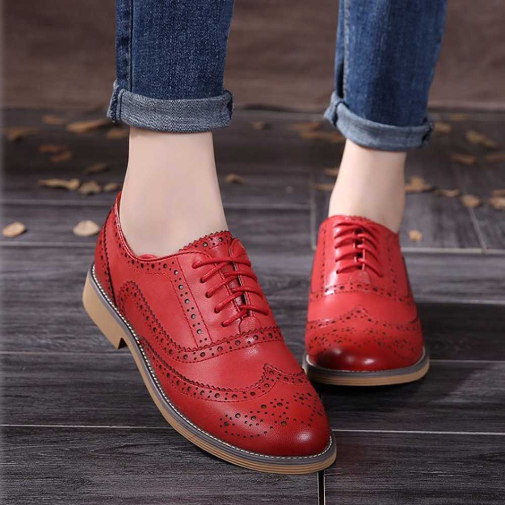 Оксфорды. Унисекс-обувь с обязательным наличием шнурков. Идеальный вариант женской одежды под эту пару: джинсы, брюки, футболка, рубашка в клетку или горизонтальную полоску. Также красные оксфорды можно надеть под деловой костюм.