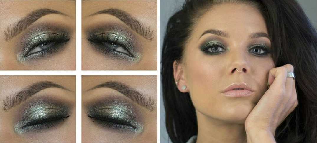 - Серо-зеленый. Самой подходящей будет молочная, шоколадная, нежно-голубая гамма теней. Сделать акцент на сером цвете помогут черные, коричневые тона.