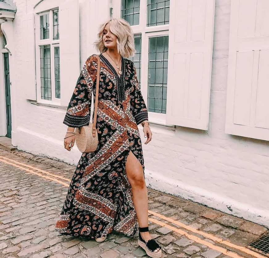 Для платьев этого стиля характерно много особенностей. У них всегда свободный крой, расклешенные рукава. Талия часто акцентируется различными ремнями или шнурками. В «бохо» всегда используются натуральные материалы, которые придают какую-то деревенскую простоту, в хорошем смысле этого слова. Нельзя встретить наряд, на котором не присутствуют многочисленные узоры, этнические рисунки, яркие принты.