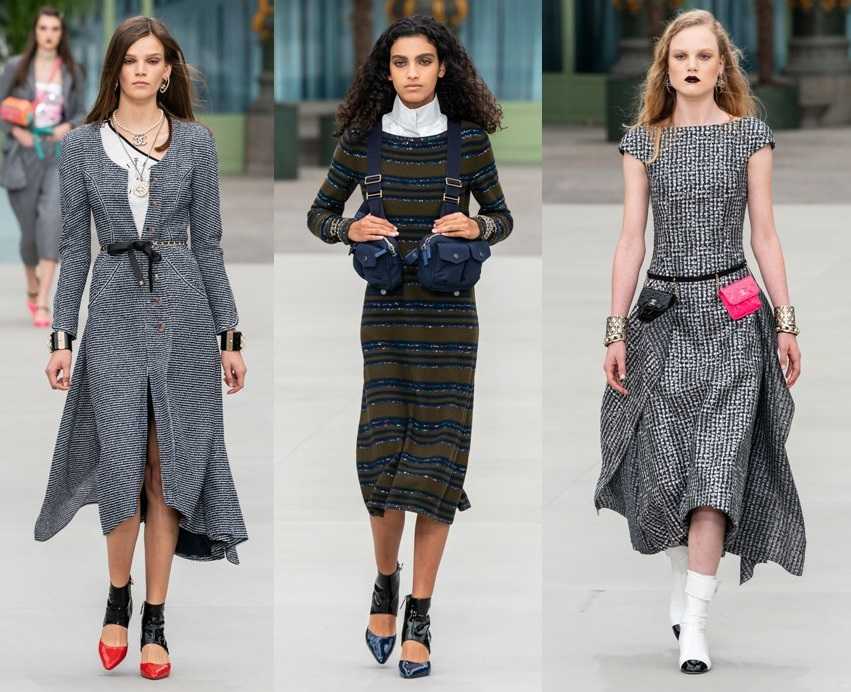 Несмотря на теплый сезон, многие дизайнеры напомнили прекрасным женщинам о практичности и мягкости вязаных платьев и фасонов из шерстяных тканей. Такие одежды — прекрасный вариант наряда для переходного периода, межсезонья. И еще раз дизайнеры подчеркивают, что они должны быть не только теплыми, но и оригинальными в пошиве, отличаться модным узором или декором. Примером тому служит модный показ от Chanel.