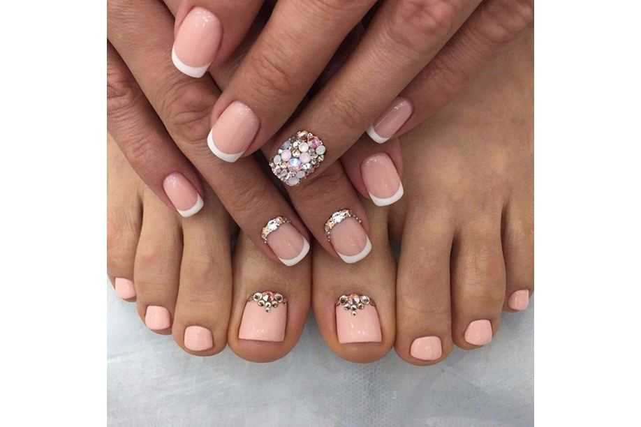 Благодаря выбору аксессуаров и цветов лака для педикюра, с дизайном френча на ногах со стразами, можно экспериментировать до бесконечности