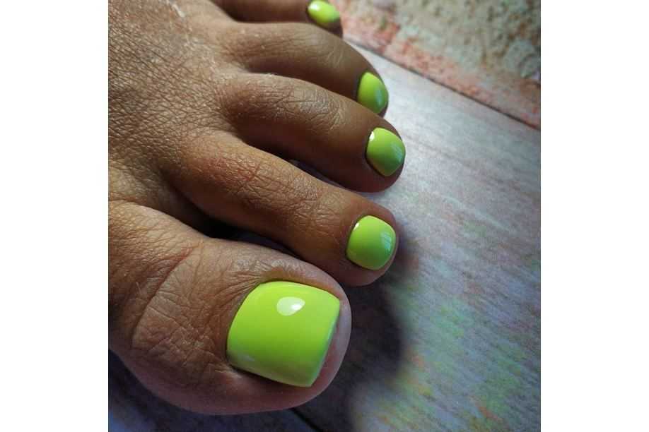 Неоновые оттенки могут быть более или менее яркими в педикюре. Первые пойдут как зимний вариант, вторые – как летний. Особенно интересен зеленый неоновый педикюр в технике градиент.