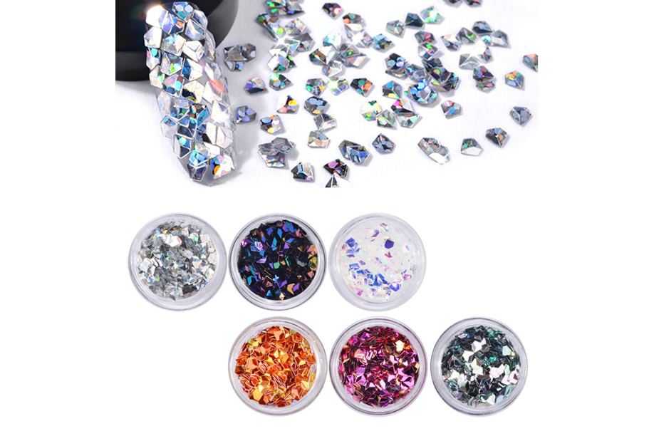 Желтая и оранжевая втирки придадут ноготкам богатое золотистое сияние, а серый глиттер создаст благородный металлизированный блеск. Уникальная разновидность глиттера – голографические блестки, которые эффектно смотрятся поверх темного лака. С их помощью мастера создают футуристические нейл-дизайны и эффект 3D на ногтях. Секрет голографических блесток заключается в том, что они по-разному преломляют световые лучи, заставляя их интересно переливаться на солнце.