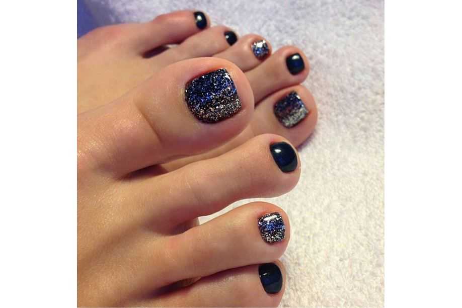 Альтернативой изысканным стразам способен послужить глиттер – это блестящая втирка для ногтей, которая используется в сочетании с лаковым покрытием. Последние тренды – зеркальный и жемчужный однотонный педикюр, а также чередование ногтей с блестящим и матовым покрытием.