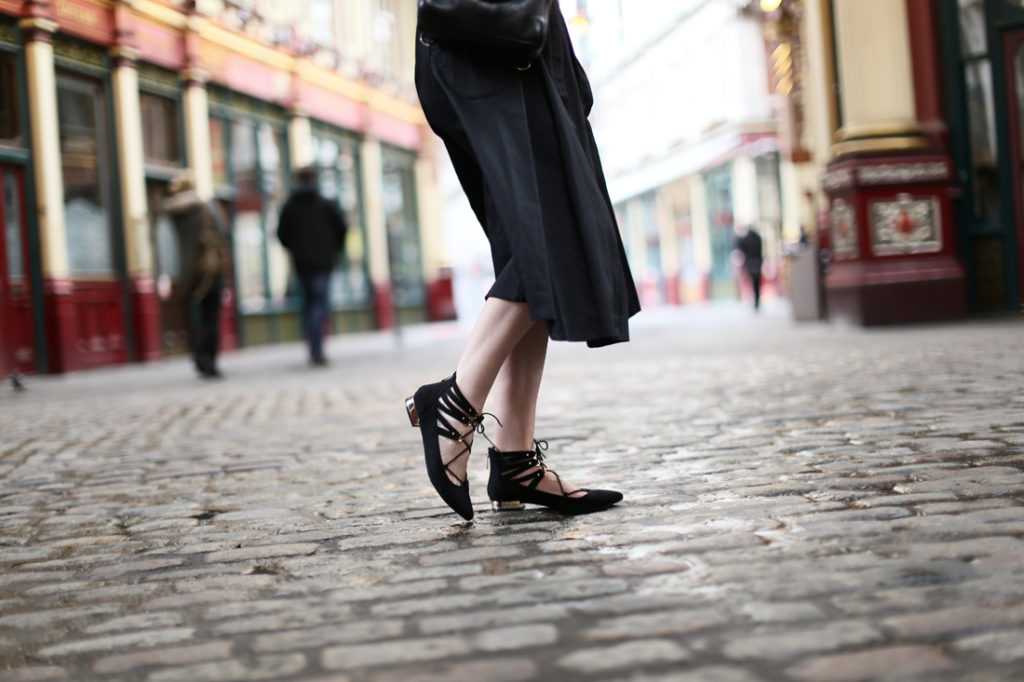 При этом подходе мы выбираем нарядную обувь по перечисленным выше признакам и составляем образ так же, как и с туфлями на каблуках: есть ли каблук на фото ниже, или нет — все равно, и в том, и в другом случае образ будет элегантным за счет формы обуви.