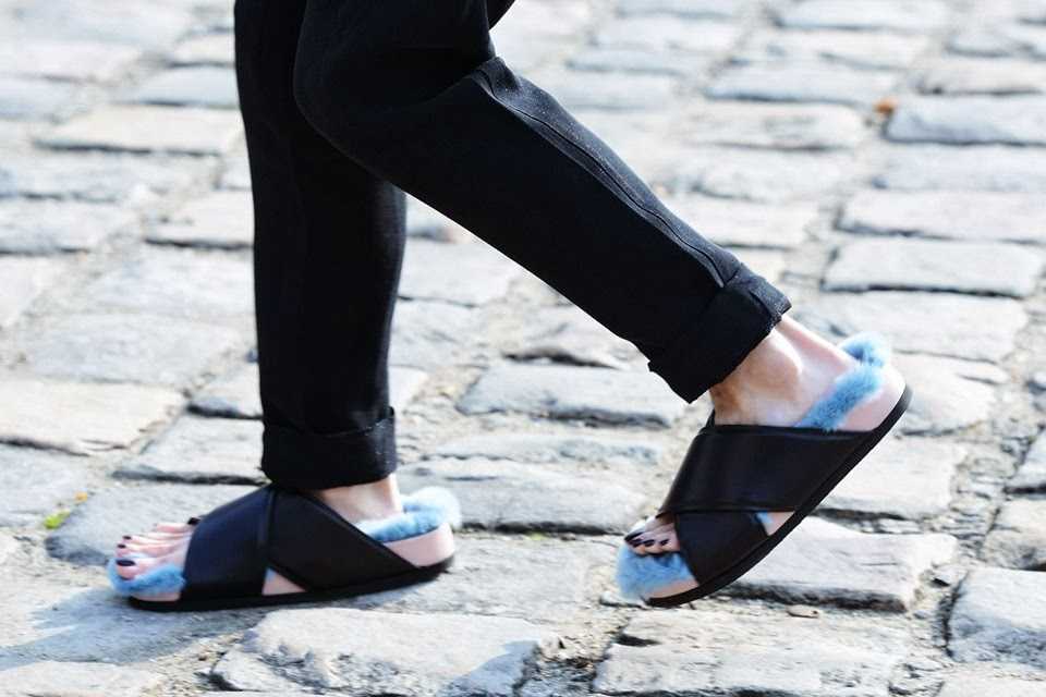 Эту же роль в образе играют разного рода тапки с мехом и странноватые мюли.