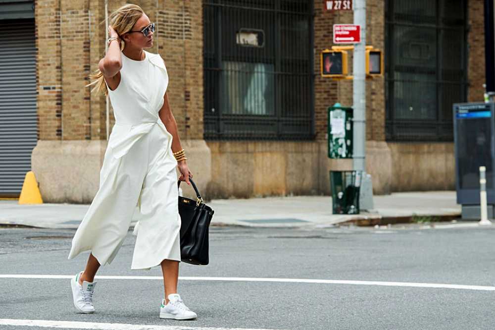 Здесь важно то, что обувь явно и намеренно контрастирует с нарядом по стилю (но идеально вписывается по цвету) и таким образом становится модным заявлением. Тот же самый наряд с балетками мог бы выглядеть компромиссом, который «не дотягивает» до ситуации, но кроссовки даже не пытаются сымитировать нарядность и выглядят по-хорошему нагло, задавая самоуверенный тон всему луку
