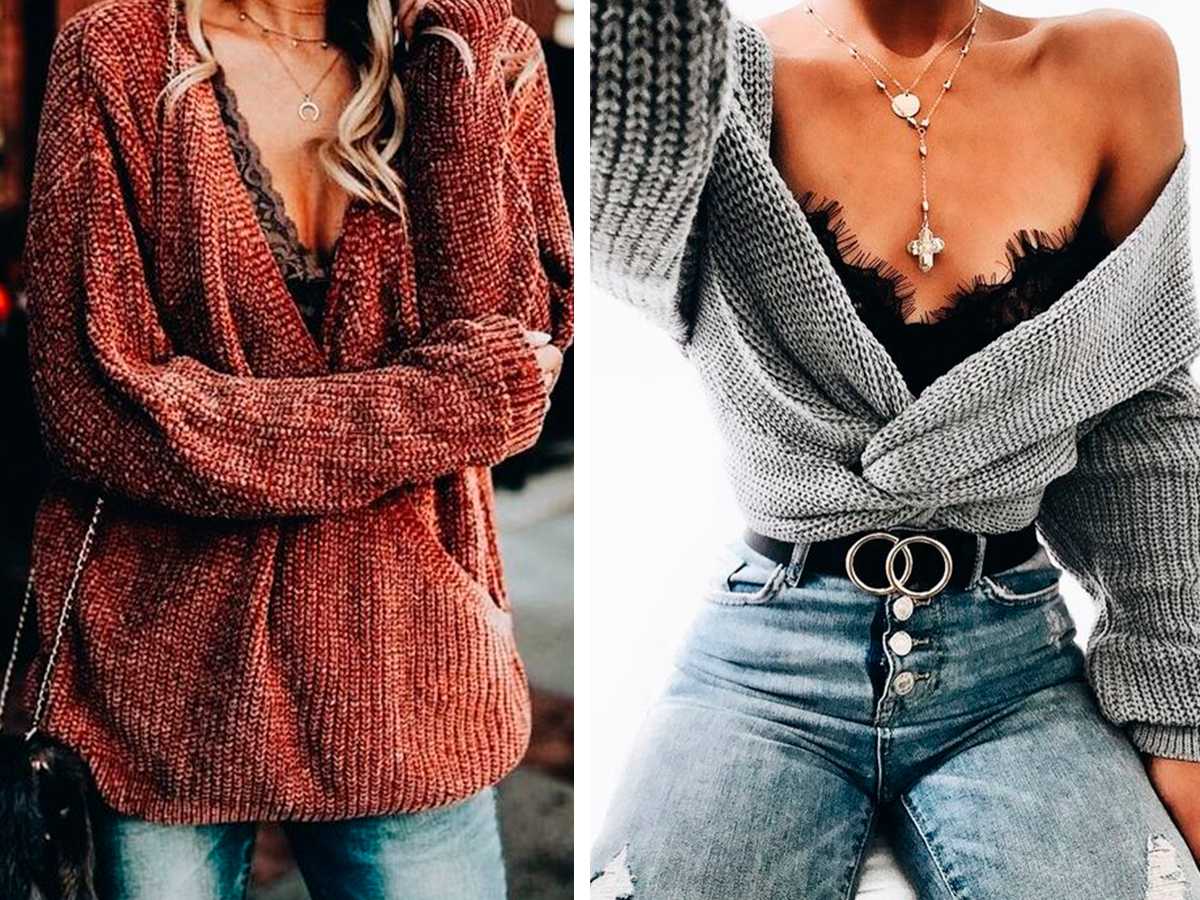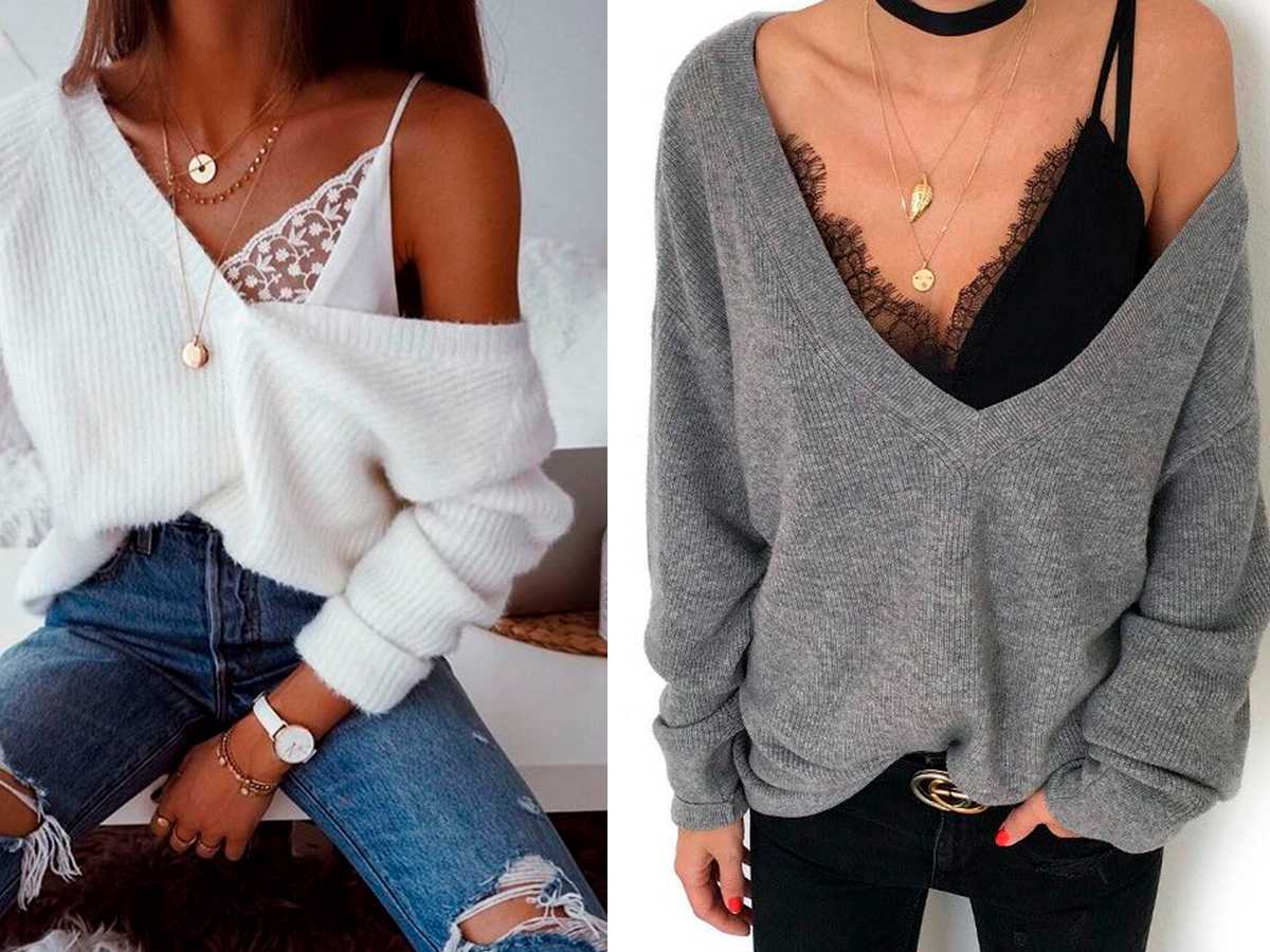 Выбираем джемпер с глубоким V-образным вырезом. Вырезы особо крупных размеров можно спустить на одно плечо.