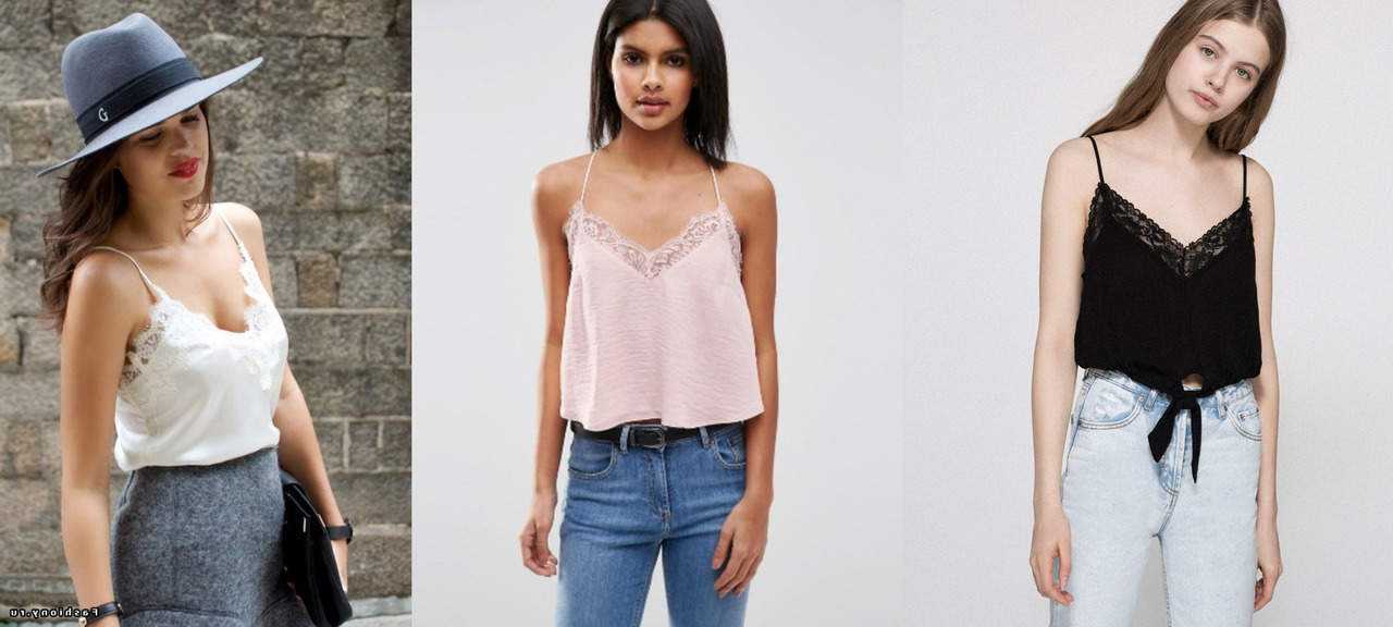 Очаровательный топ на тонких лямках – самый простой и скромный образец одежды актуального тренда. Предыдущее поколение женщин носило такие майки исключительно под одеждой, как бюстгальтеры, и приравнивало их к нижнему белью, а сегодняшние тенденции фэшн-индустрии призывают открыто демонстрировать нежные и волнующие предметы гардероба, будоража мужские сердца.