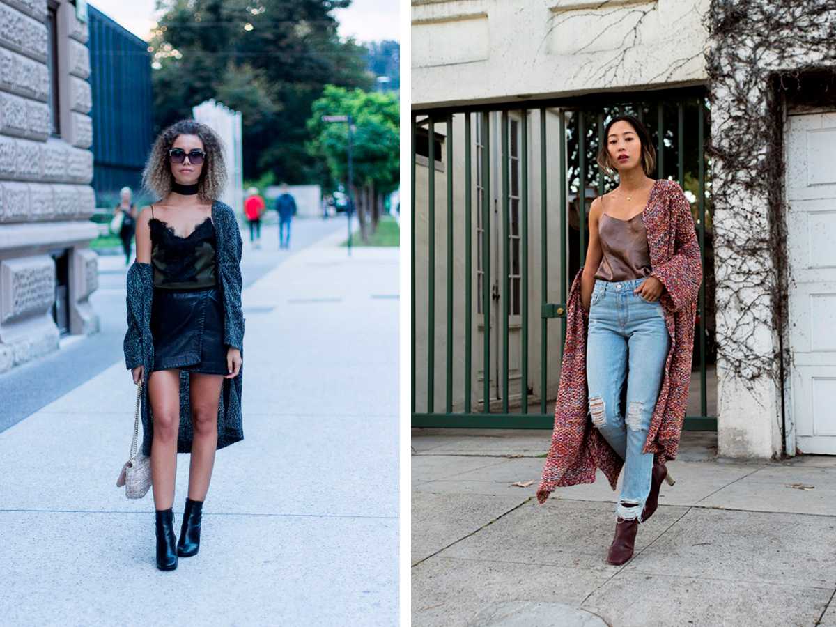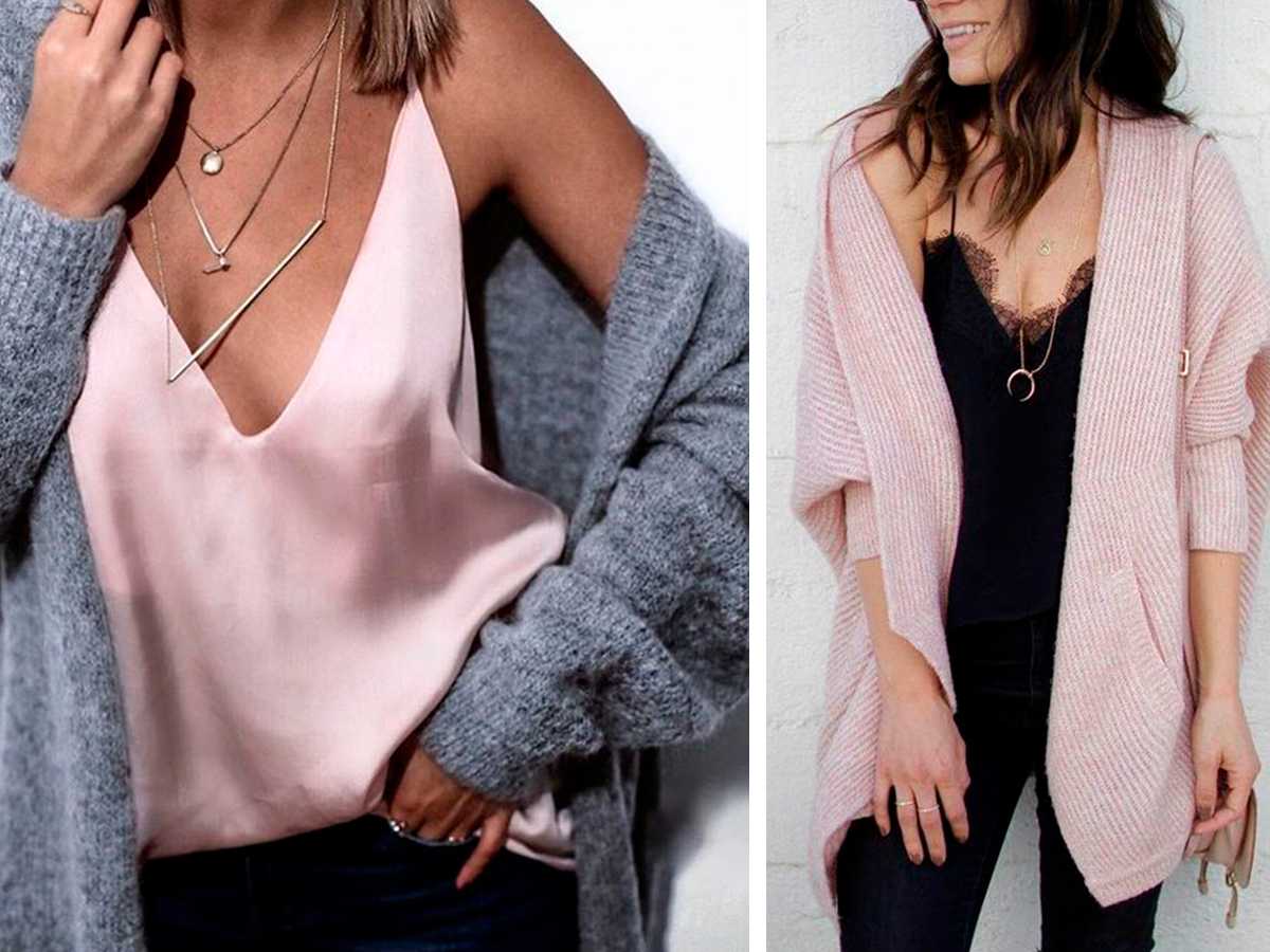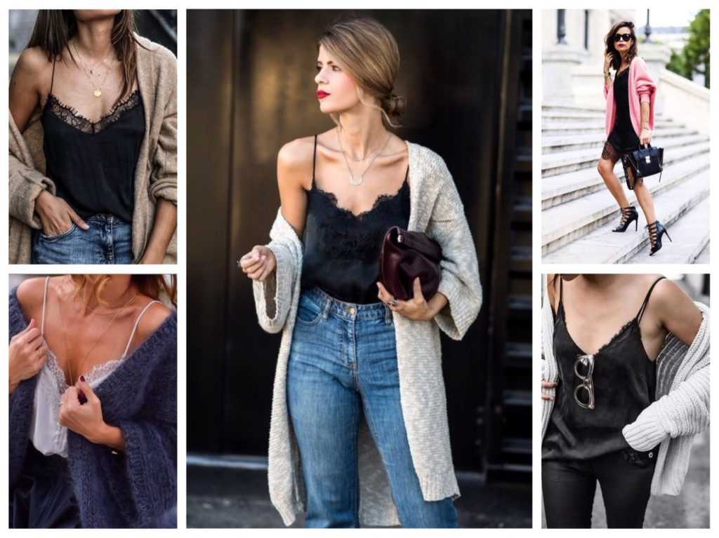 Как и в случае с косухой, здесь тоже работает правило, где что-то нежное идеально смотрится с чем-то грубым. Поэтому сочетаем с шелковым или атласным гладким или топом с кружевом кардиган крупной вязки и джинсы!