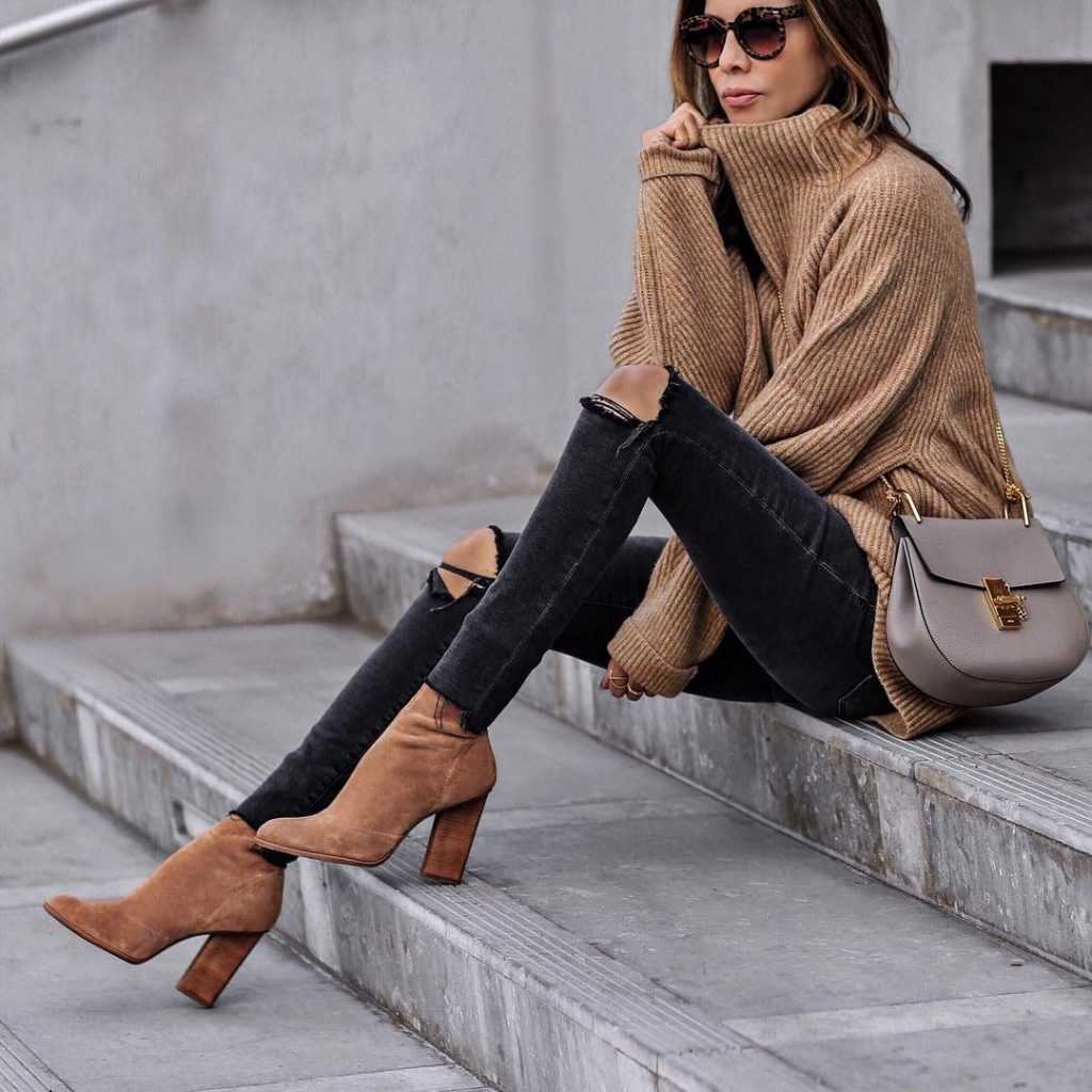 Обувь на устойчивом каблуке больше подходит к нарядам кэжуал. В повседневных городских аутфитах попробуйте сочетать ботинки на среднем каблуке с леггинсами, платьем, тренчем, кардиганом или свитером оверсайз. Лук с зауженными брюками и объемным свитером смотрится по-осеннему уютно.
