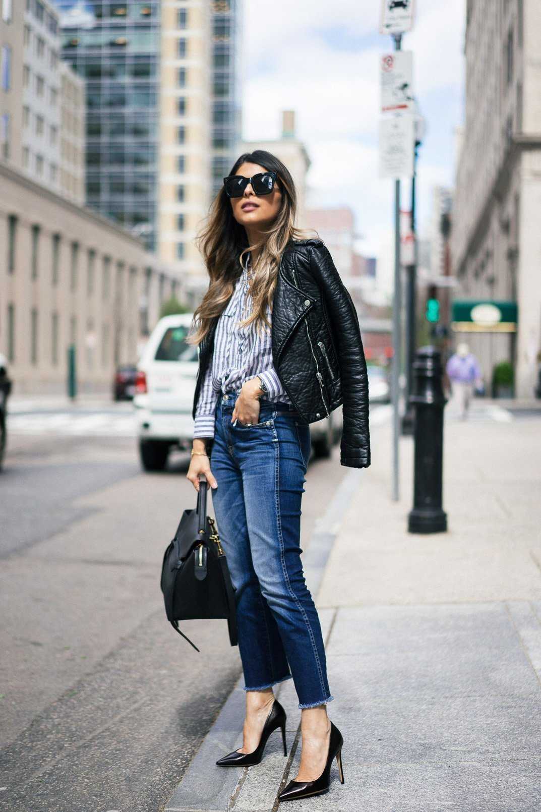 Очень часто на фото модели комбинируют косуху с бойфрендами, создавая повседневный и в тоже время современный стиль. Такое сочетание требует грубой обуви, которая отображает мужское направление, и легкий женственный верх (шелковая, шифоновая блузка).