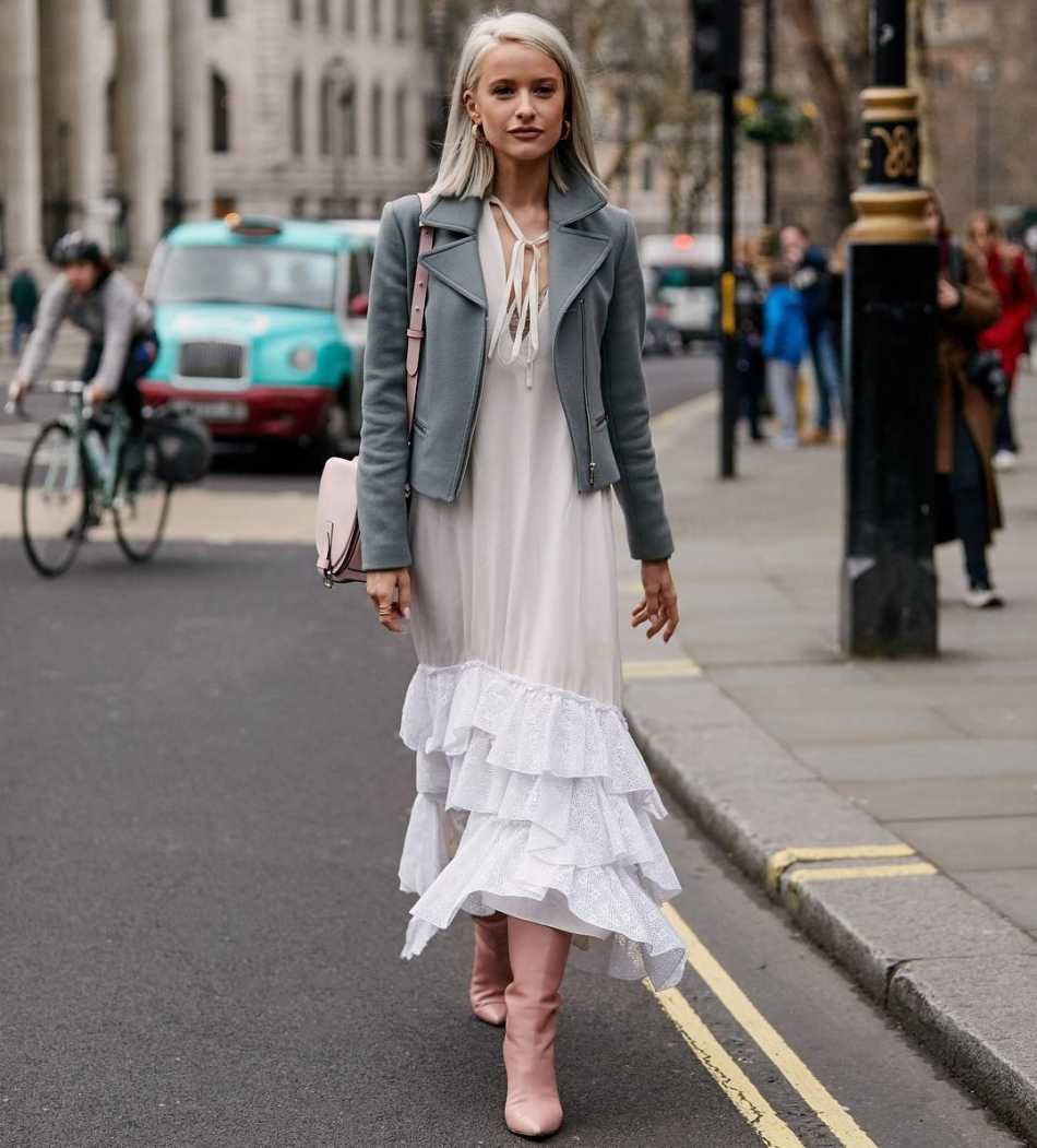 Таким образом бомбер oversize пудрового оттенка изумительно сочетается с коротким светлым платьем. А эффектно дополнят образ экстравагантные босоножки на каблуке.