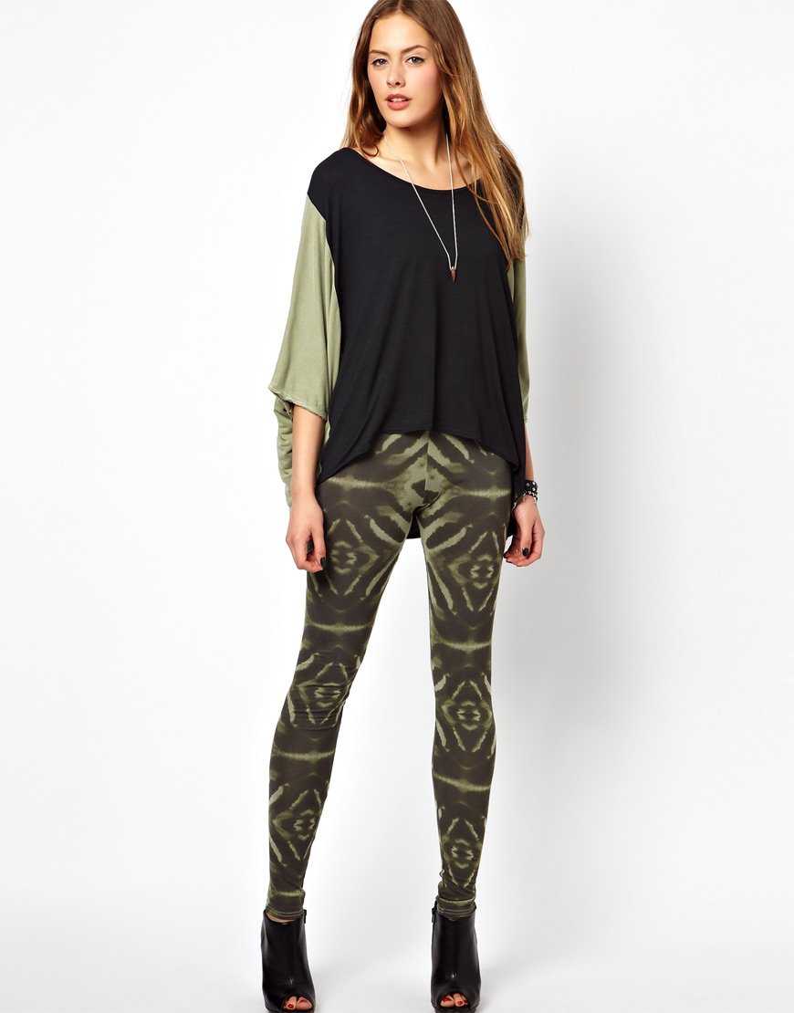 Неплохой вариант — легинсы с камуфляжным принтом, светлая майка с розовым рисунком, черный пиджак и красные туфли на каблуке. Можно подобрать брюки оливкового цвета, песочный объемный свитер и ботинки. Легинсы в зелено-желтой гамме и белый джемпер и кроссовки — образ на каждый день.