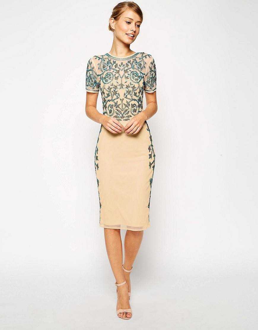 Для вечерних платье миди используются специальные ткани. Это атлас, бархат, парча, тафта, гипюр, креп, шифон, кружево и прочие. Последний материал придает одежде романтичность, изысканность, но его легко порвать, и он плохо драпируется. Парча прекрасно держит форму, обладает привлекательным блеском, имеет хорошую прочность. Ее основные недостатки: сложность ухода, высокая стоимость. Атлас имеет нежный блеск, хорошо держит форму, но может растягиваться со временем, имеет достаточно большой вес.
