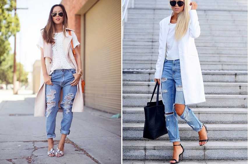 Традиционная пара: джинсы и рубашка никогда не выходят из моды. Рваные джинсы отлично дополняются полосатыми, джинсовыми или клетчатыми рубашкам и. Эти комплекты могут выглядеть по-мальчишески, если надеть к ним кеды или слипоны. А могут быть очень женственными и стильными, если добавить к ним туфельки на каблуках и элегантный клатч. Сегодня принято носить рубашку навыпуск или небрежно частично заправленной.