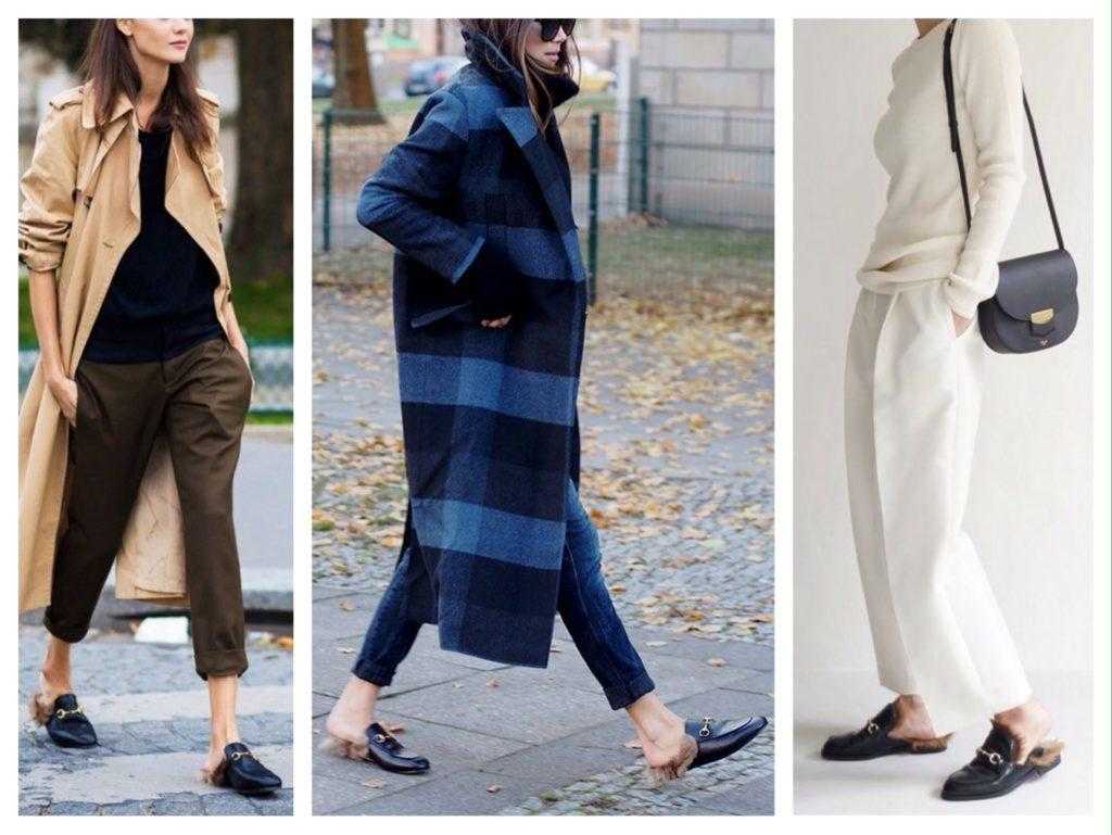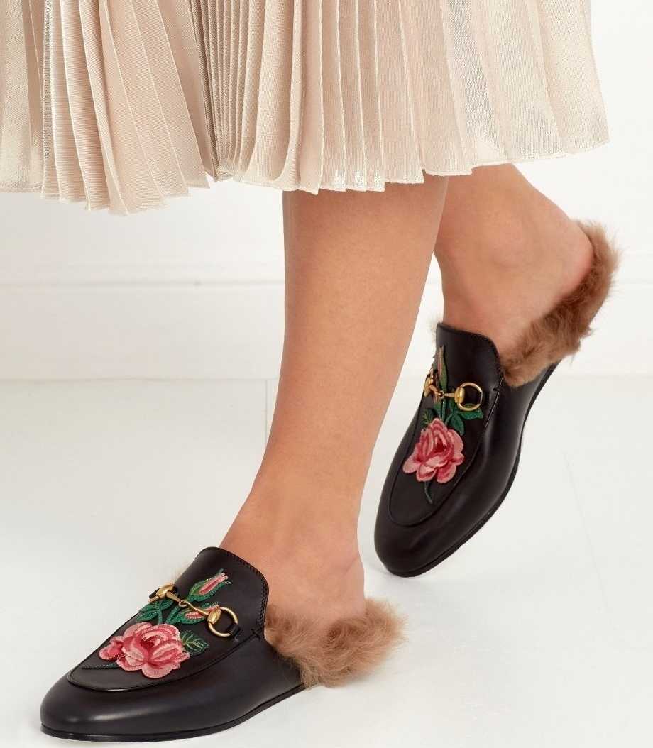 Особой популярностью пользуются лоферы и мюли Gucci и Mary Katrantzou. Последние напомнили модницам о тех временах, когда такую обувь использовали исключительно для приема важных гостей. Мюли Гуччи с мехом доказали, что эти шлепки можно использовать, как в торжественной, так и в неформальной обстановке. Такие мюли совсем не обязательно комбинировать с теплой одеждой. Они неплохо сочетаются и с летними комплектами.