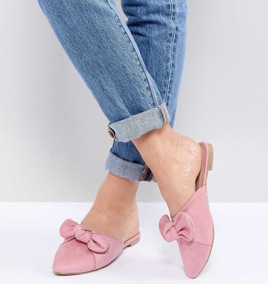 - Распространяющийся тренд — утрированно большой бант. Особенно изысканно смотрятся мюли пастельных оттенков, например, бледно-розовые, с бантом черного цвета.