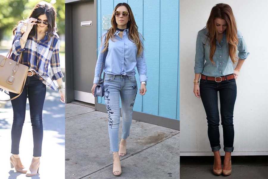 Голубые джинсы, переходящие в синий цвет, дают возможность ежедневно экспериментировать с образами. Комплект с ними в сочетании с нейтральными блузами (черными, белыми, бежевыми), подойдет практически к любой ситуации. Если есть желание добавить яркости, тут поможет обувь или сумка насыщенного цвета. Отлично сочетаются с ними рубашки, особенно клетчатые.