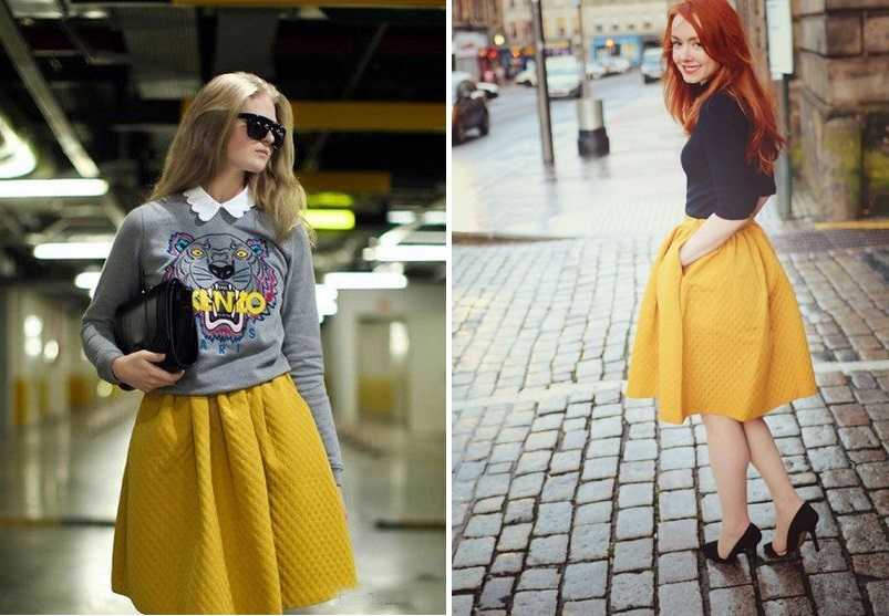 Самое главное оружие в арсенале любой молодой девушки! Мини-юбка едва прикрывает бедра, из-за чего и смотрится очень сексуально. Носить желтую мини-юбку следует с закрытым верхом – шелковыми блузами сини и черных тонов, плотными водолазками зеленого или фиолетового цветов, с топами и рубашками повседневного стиля. Можно надеть к мини туфли или сапоги на высоком каблуке в тон юбке или топу, а также завершить наряд классическим жакетом.