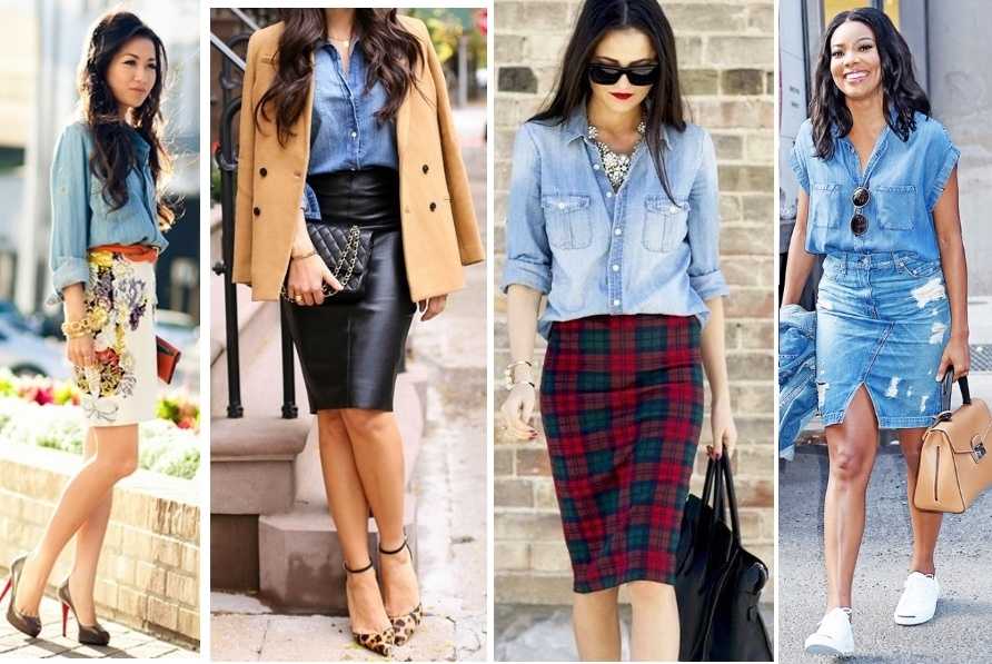 Кожаную юбку-карандаш в сочетании с рубашкой из денима можно надеть в офис. В этом случае верх должен быть застегнут на все пуговицы. Завязывать на узел не рекомендуется.