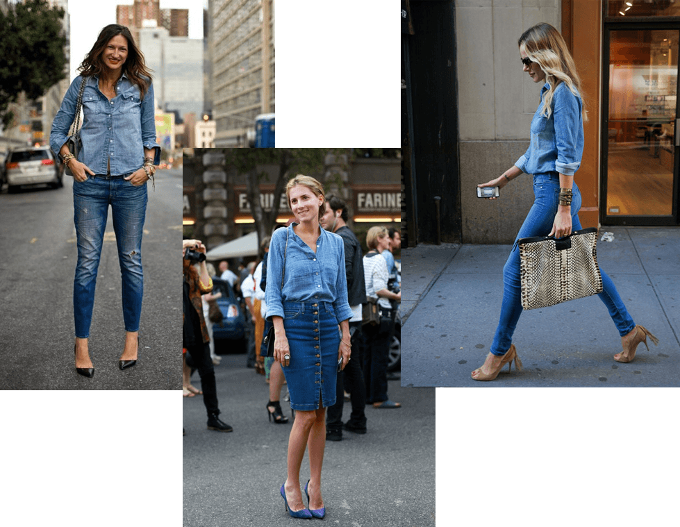 Джинсы в таком комплекте должны быть на тон ярче верха, заправив рубашку во внутрь, мы сделаем образ более сдержанным, при носке на выпуск придадим комплекту легкости и непринужденности. Завершат ваш образ туфли на каблуке.
