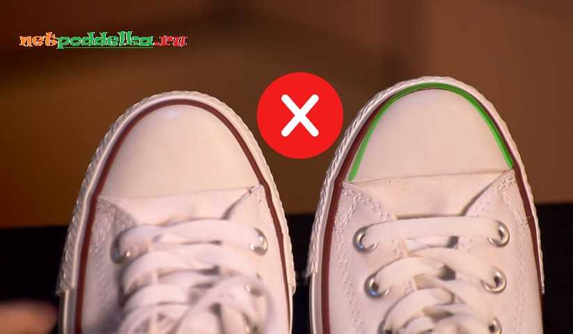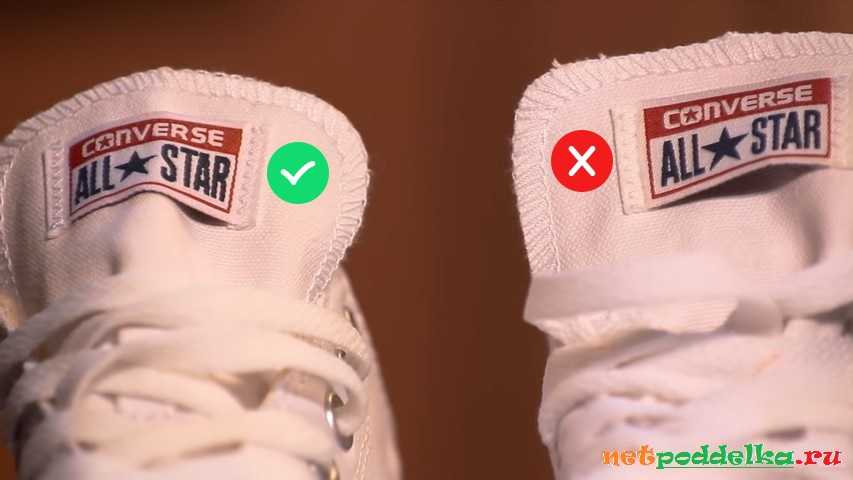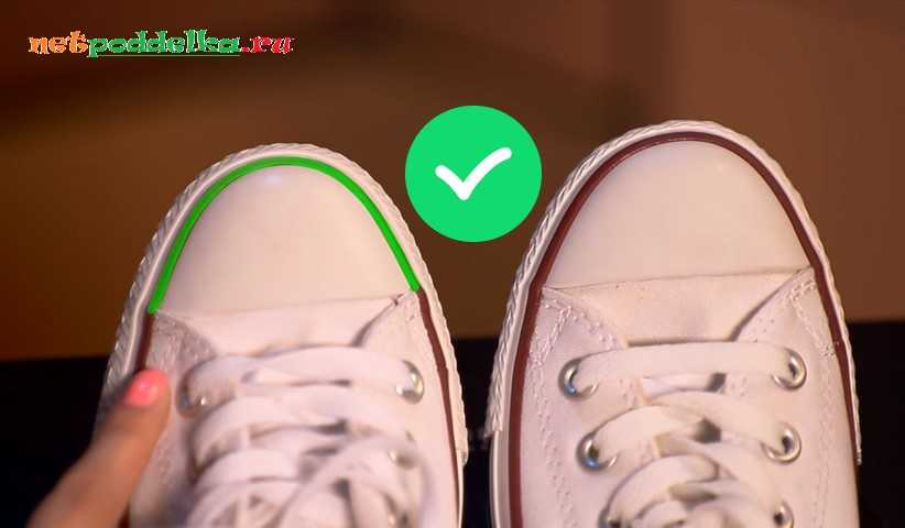 Конверс имеют мысок удлиненной фирменной формы. Он обеспечивает удобство ноге и снижает риск травматизма пальцев. У реплик мысок более округлый. Носок фальшивки легко гнется под нажатием.