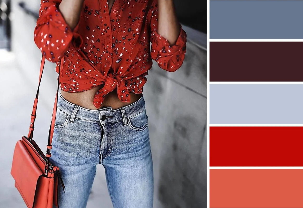 Также можно сочетать такие модные цвета 2022-2023, как красный, синий и розовый. Для этого нужно иметь в своем гардеробе светло-розовую блузку, синие джинсы и красный кардиган. А дополнить такой стильный лук помогут лодочки и клатч красного или бежевого цвета.
