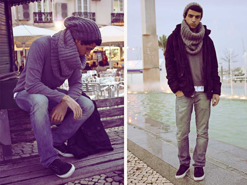 В основном, мужчины носят шарфы в холодное время года. Комплект: шарф-снуд, куртка, джинсы и ботинки, самый актуальный и востребованный, среди молодежи.