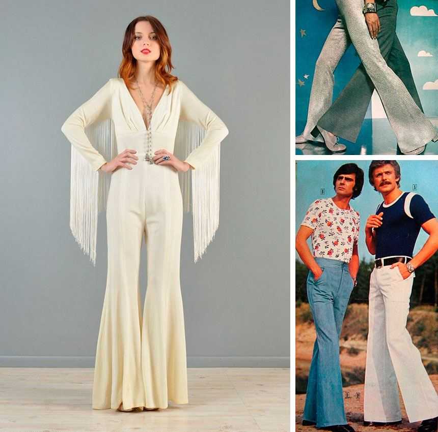 - Брюки. Их популярность возрастала, и параллельно с этим росло количество разнообразных фасонов. Они были представлены клешем во всех вариациях. К концу десятилетия все чаще стали использоваться узкие фасоны.