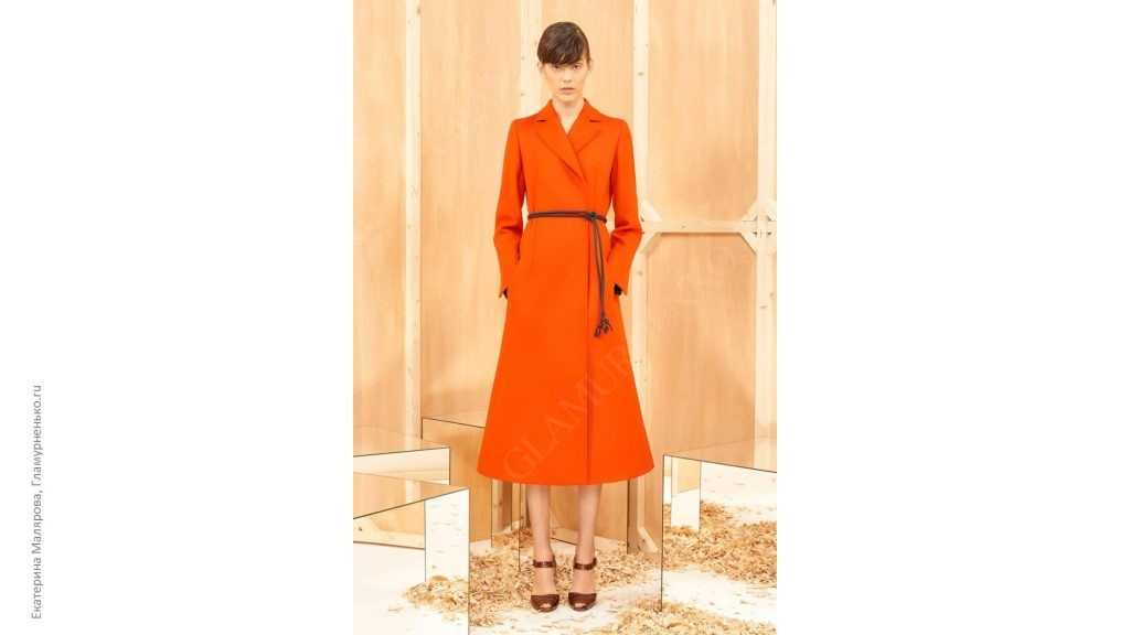 На фото – оранжевый цвет в пальто. В таком варианте он может стать олицетворением осени с ее роскошным багрянцем и золотом или, наоборот, подчеркнет скорое пробуждение природы ото сна.