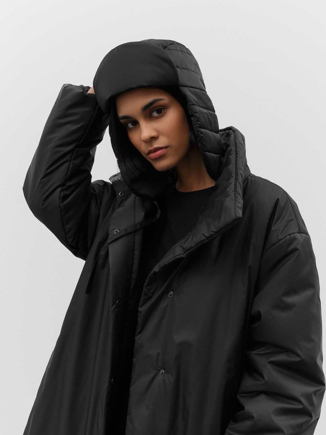 - Оверсайз. Хорошо смотрится с ярким снудом, с ботинками, с черными перчатками и лаковым рюкзаком.