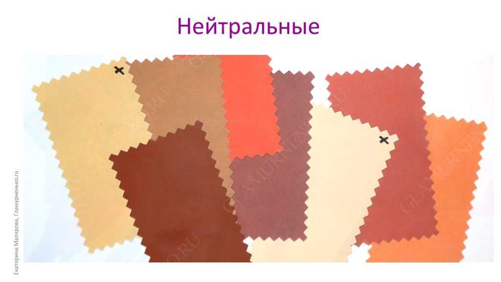 Что касается бежевых и коричневых нейтральных оттенков осенней гаммы, то в них, в отличие от «весенних» вариантов с легкой желтинкой, ярко выражено присутствие красного и оранжевого. Для представительниц осеннего цветотипа подойдут коричнево-бежевые и золотисто-бежевые оттенки, цвет корицы, ржаво- или красно-коричневые, а также медные оттенки.