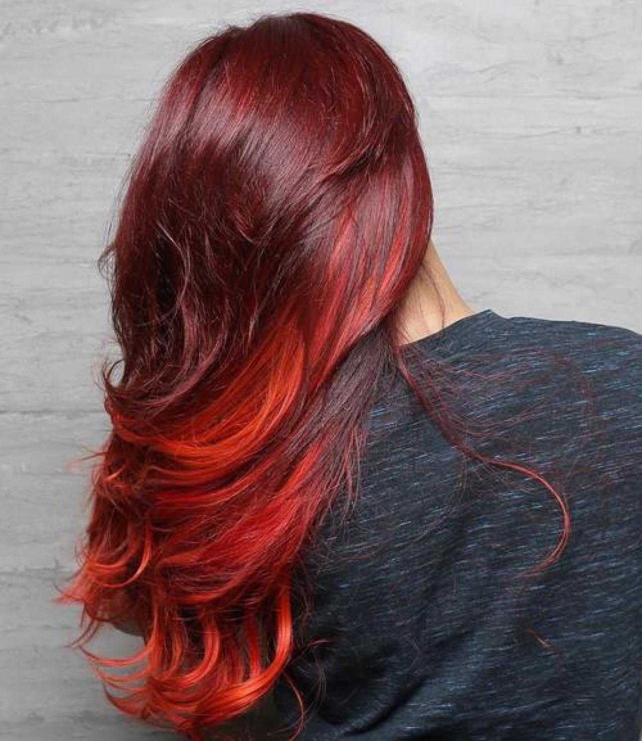 - Эффект пламени – это способ окрашивания, который практикуется на жгучих брюнетках. Вместо осветления концы красятся в огненный оттенок (медный, золотистый, благодаря чему создается эффект огня).