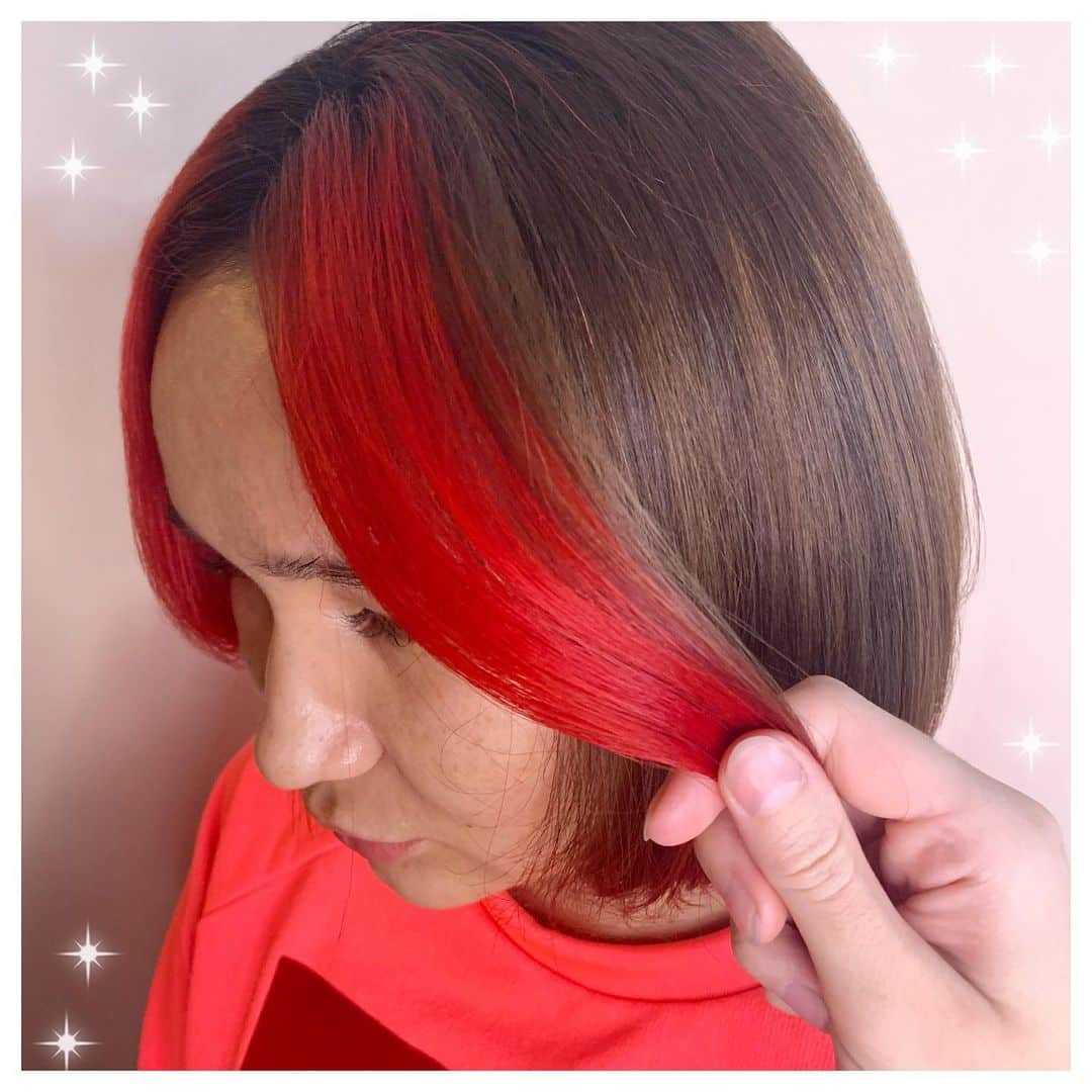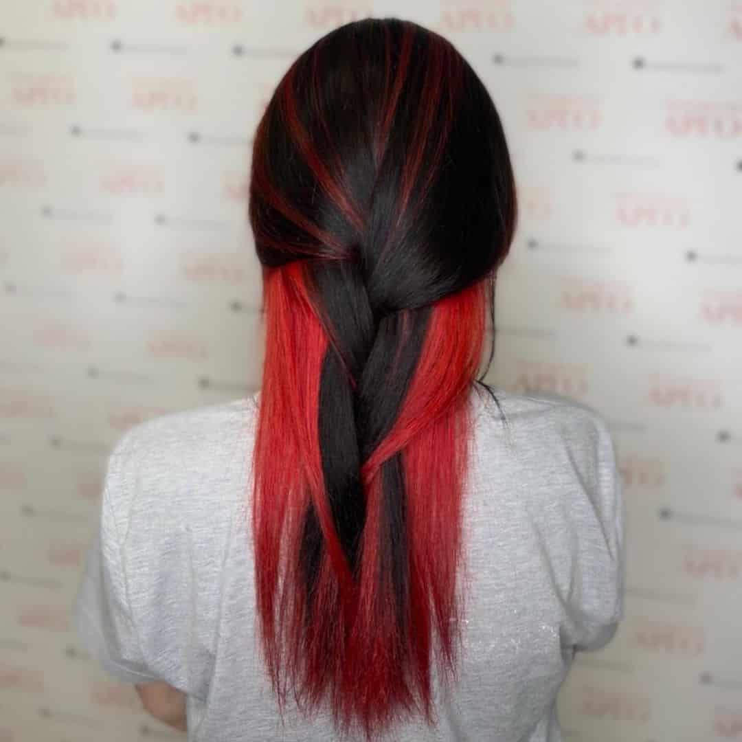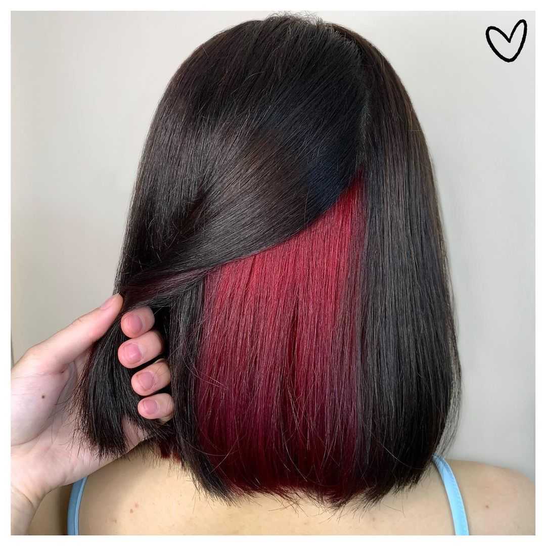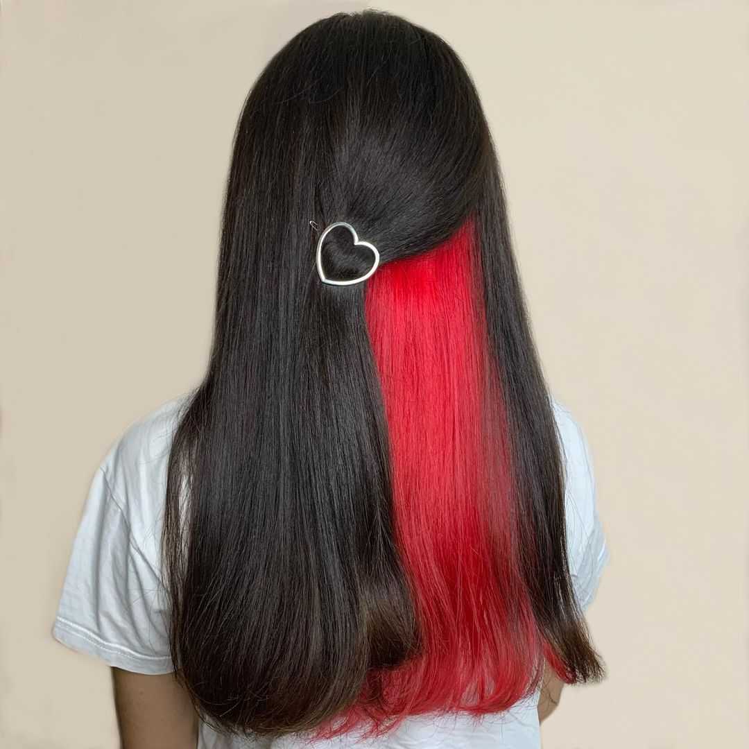 Скрытое окрашивание волос красным цветом появилось не так давно. Верхняя часть прически выполнена в натуральном цвете волос, но если сдвинуть прядь в сторону, то можно увидеть красную капну.