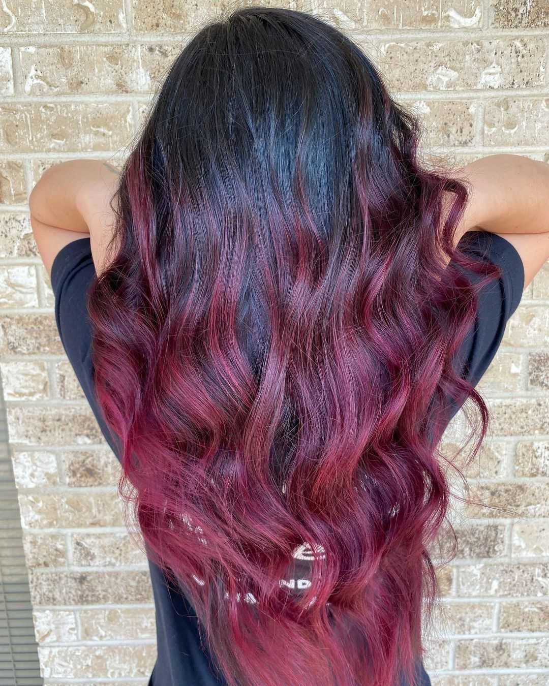 Омбре в красном цвете может быть выполнено с резким или плавным переходом. Интересное сочетание красного с черной, розовой и фиолетовой палитрой.