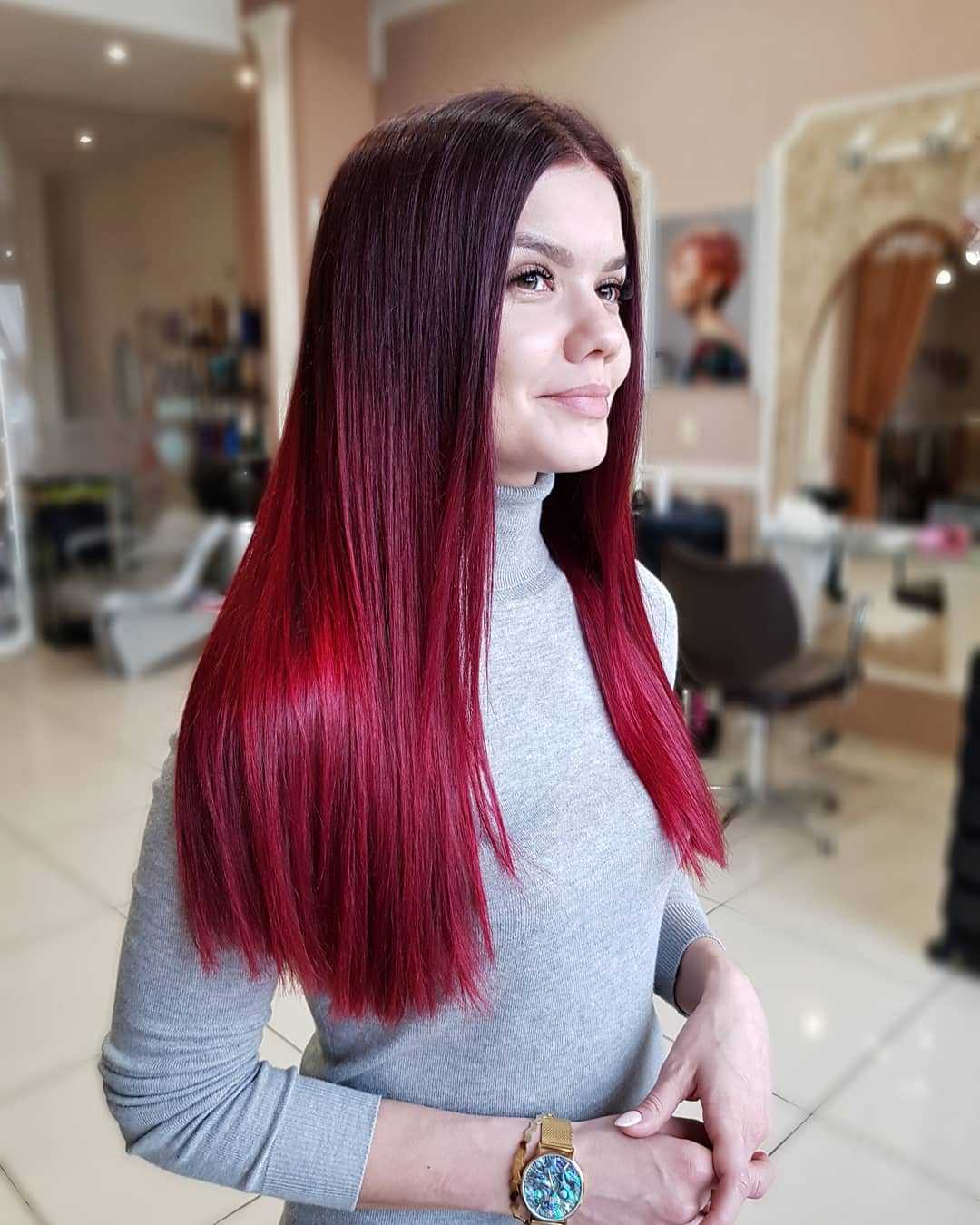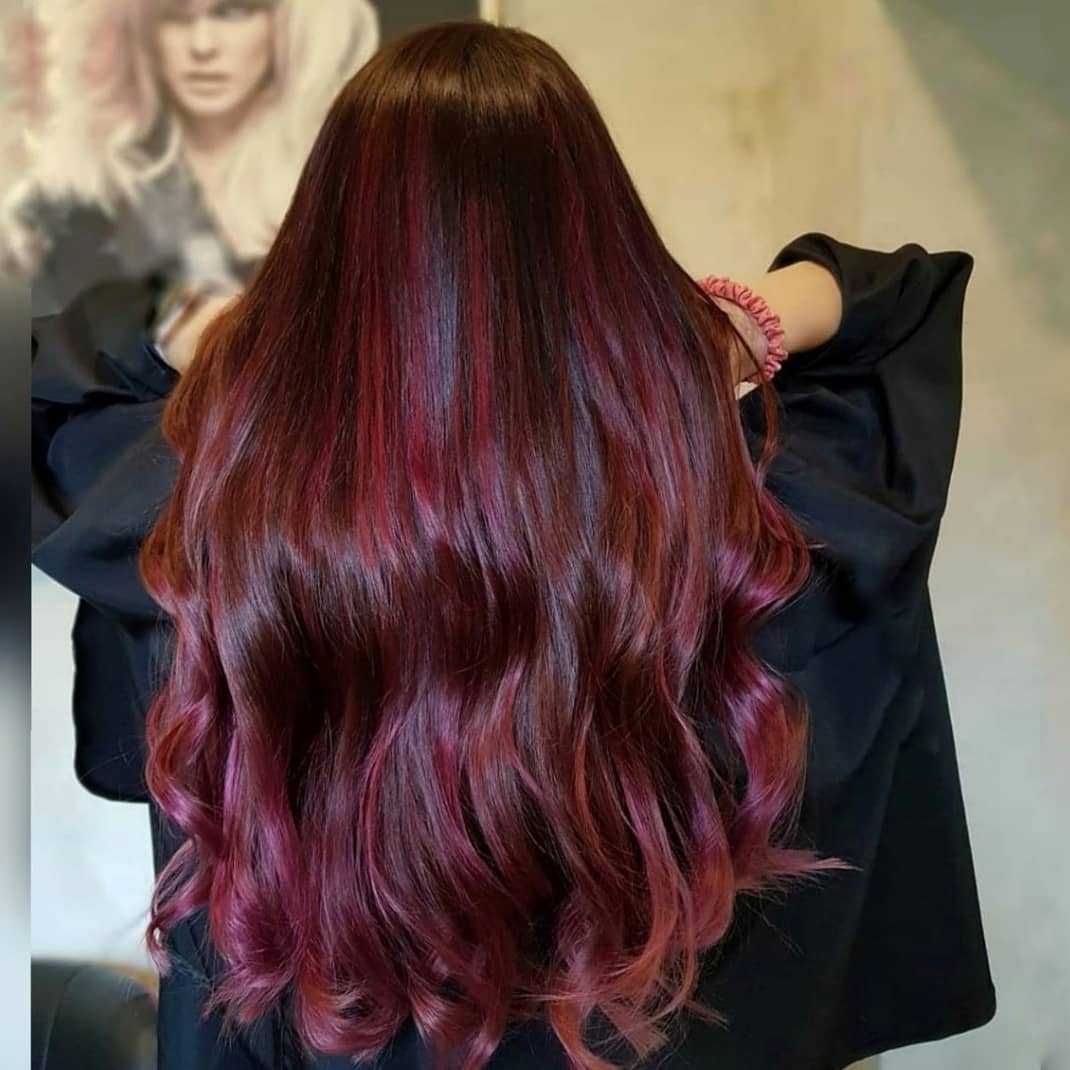 Красно-коричневые оттенки неплохо смотрятся на прическах разной длины. К услугам модниц равномерное окрашивание в один тон волос по всей длине, мелирование, колорирование, омбре и другие модные тренды. Мастера предлагают выделить корни или сделать бордовые кончики.