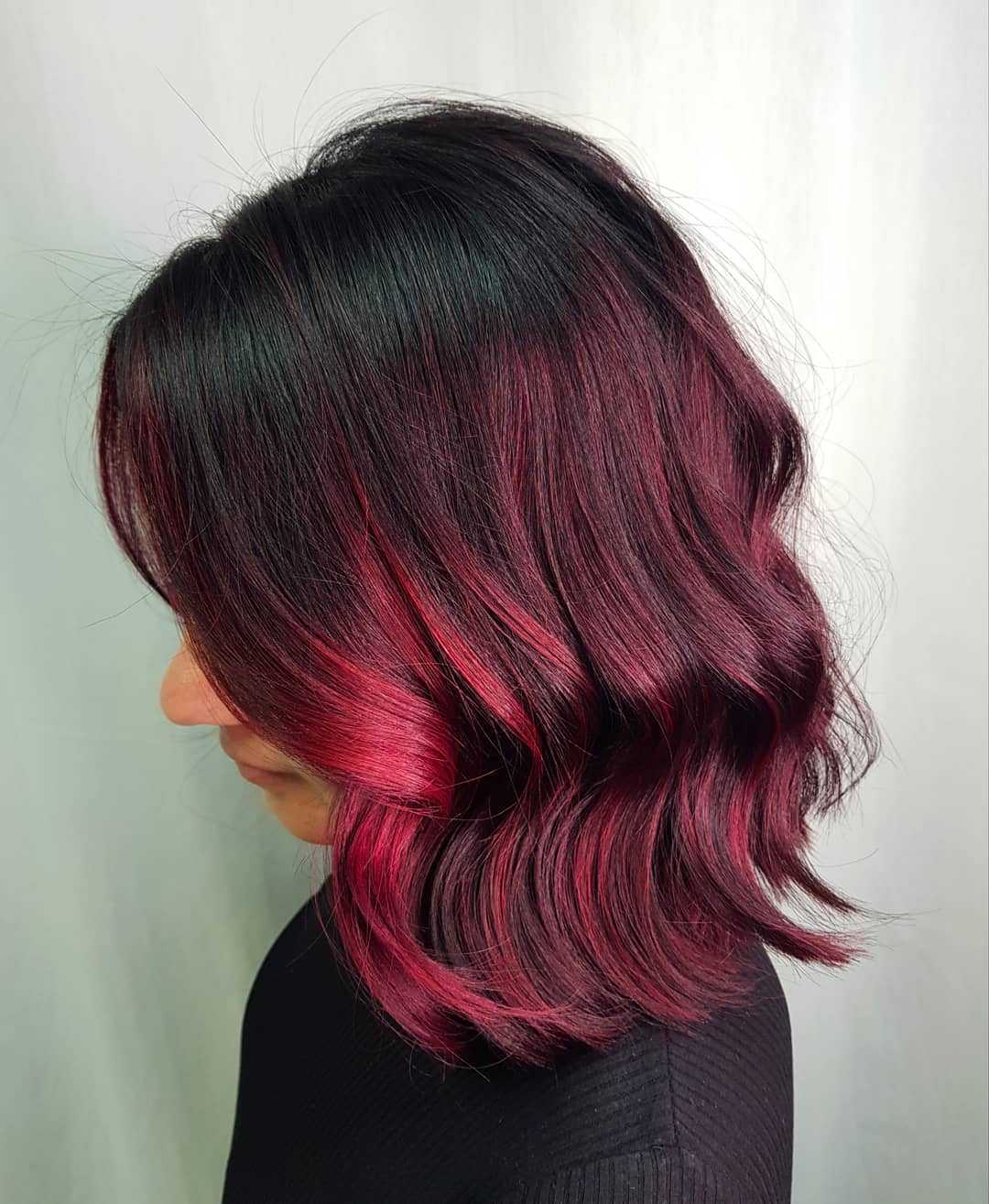 Прически средней длины дают больший простор воображению. Есть возможность выполнить колорирование: осветлить пряди, затемнить корни, вплести локоны близкой тональности. Волосы цвета “бордо” на фото показывают его богатство.