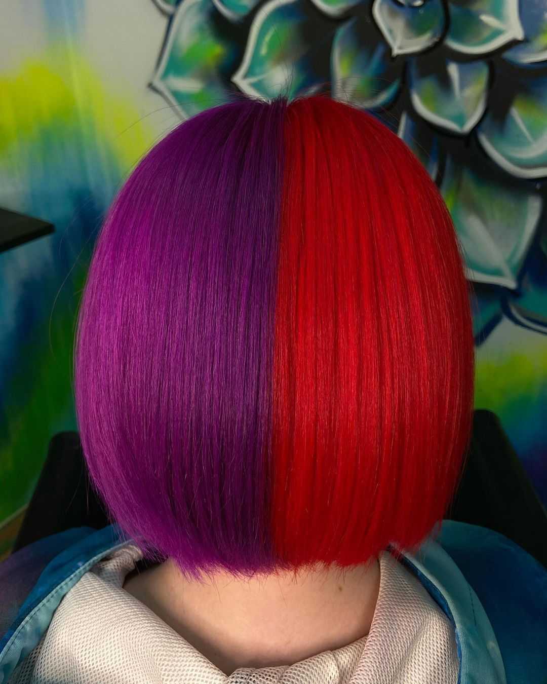 Окрашивание в два цвета с резким переходом подходит смелым девушкам. Комбинировать можно со схожими цветами, например, розовый и фиолетовый, и с контрастными – бирюзовый, голубой, зеленый и оранжевый.